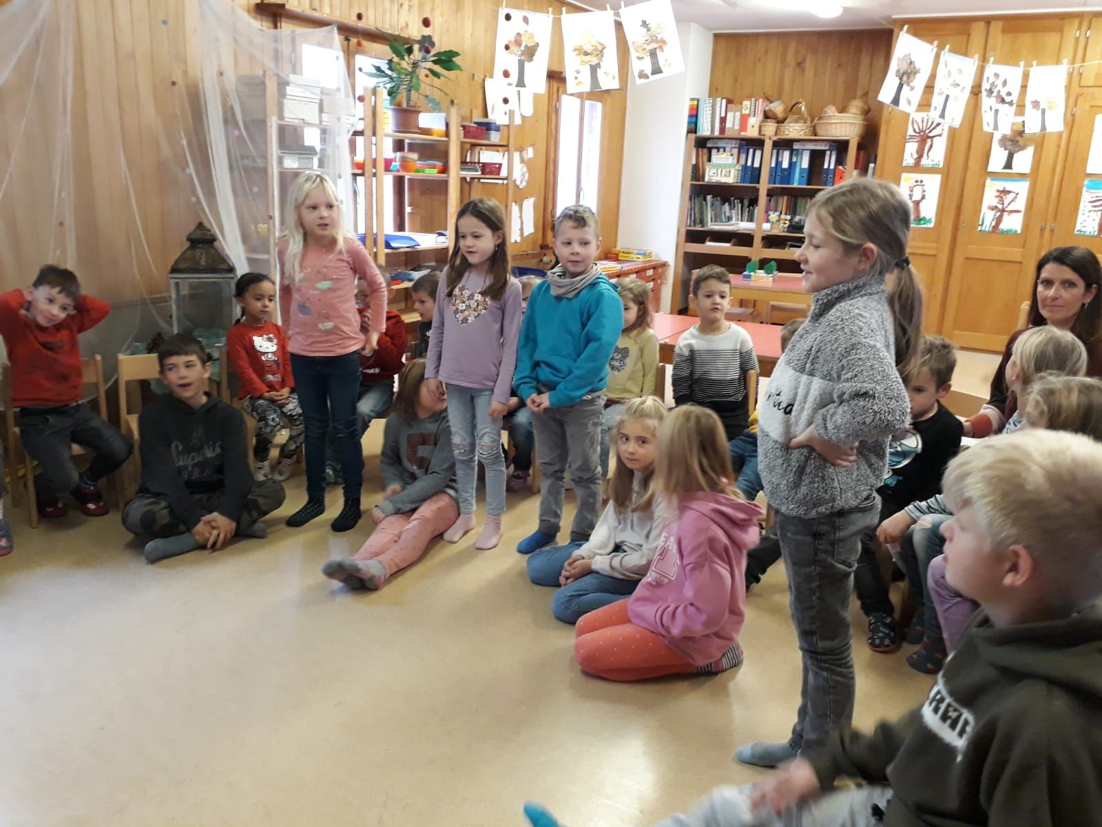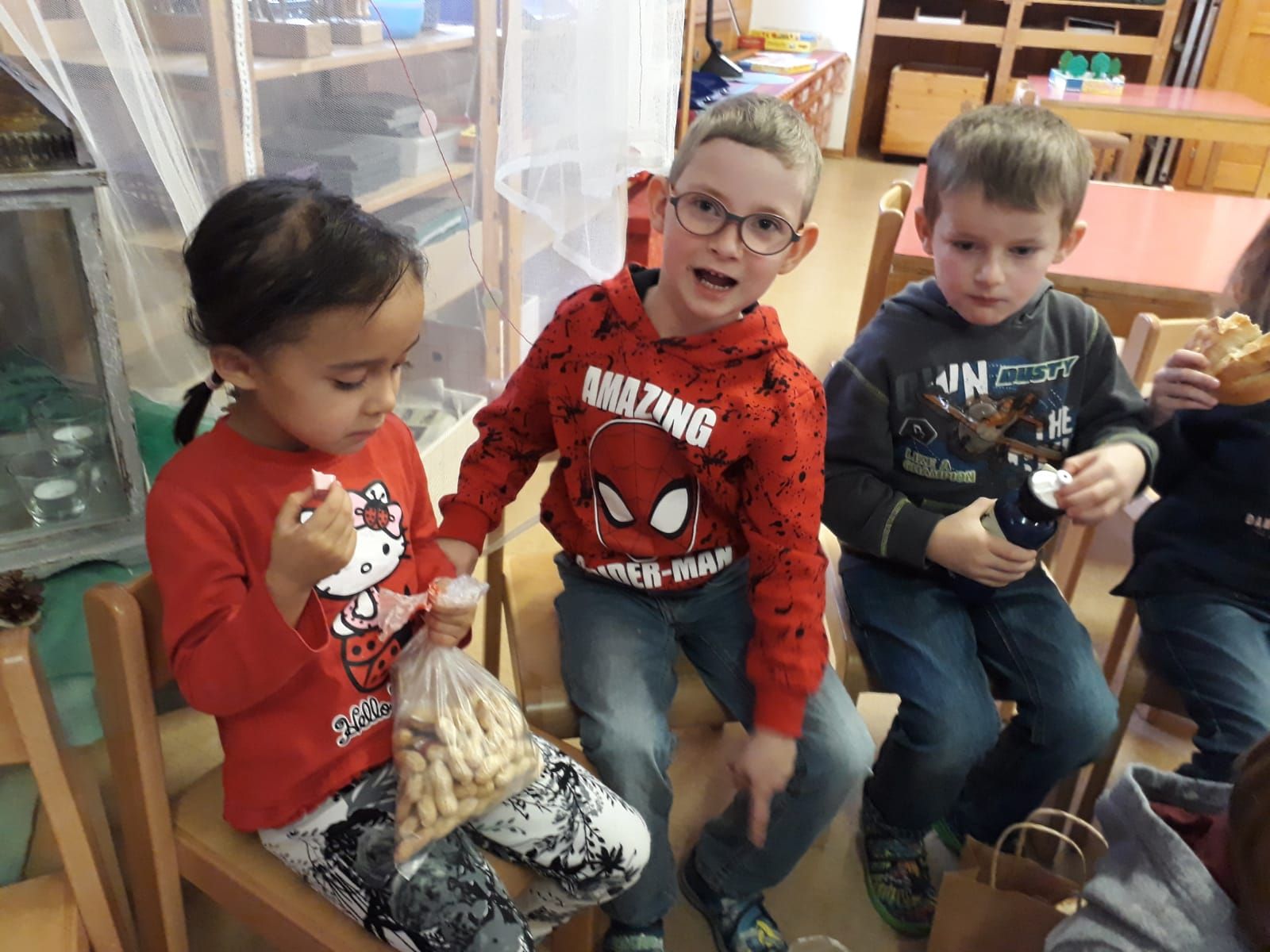 Erdnüsse lagen auf dem Schulhausplatz und die Chlousesäckli waren verschwunden, als die Schüler der 1. bis 3. Klasse in die Schule kamen. Der Samichlous musste sie abgeholt haben. Aber woher kamen die Nüsse? Hatte er vielleicht ein Loch im Sack? Dem mussten wir nachgehen! Aufgeregt folgten wir der Nussspur. Vor dem Kindergarten verlor sich jedoch jeder Hinweis. Als wir bei den Kindergartenkindern nachfragten, waren auch ihre bereitgelegten Chlousesäckli weg. Um uns von der Suche zu erholen, luden sie uns ein, eine Pause einzulegen. Während die Kinder noch rätselten, was wohl passiert sein könnte, hörten wir plötzlich ein Glöcklein. Kurz darauf zogen der Samichlous mit Schmutzli vor dem Fenster vorbei. Dann klopfte es. Die Aufregung war gross, doch sobald die beiden im Kreis Platz genommen hatten, hörten die Kinder gespannt seinen Worten. Der Samichlous wusste zu jeder Klasse genau, was sie gut machen und woran sie noch arbeiten müssen. Er beantwortete geduldig die Fragen der Kinder und hörte ihren Erzählungen zu. Natürlich hatte er auch jedem Kind ein gefülltes Säckli.
