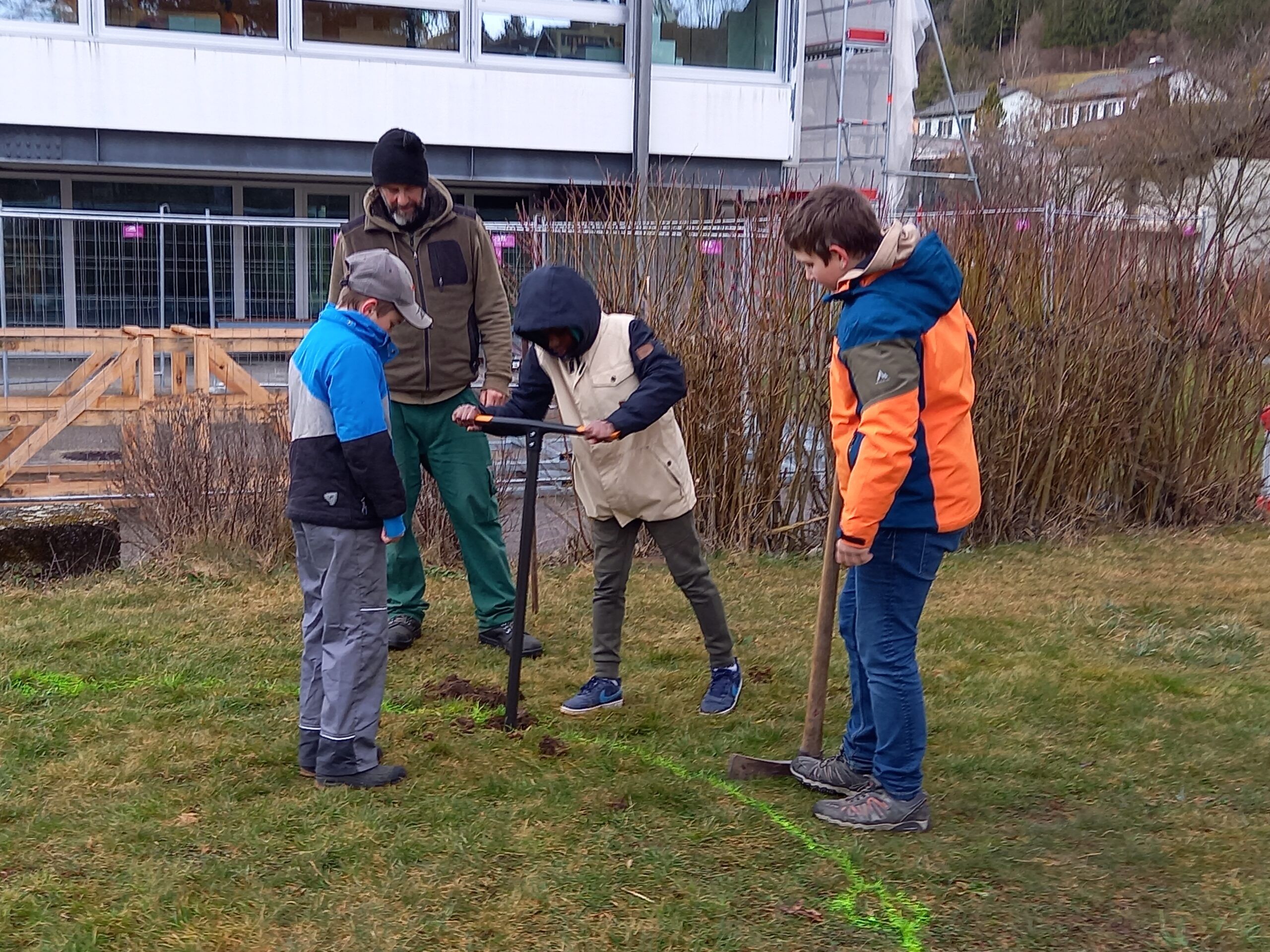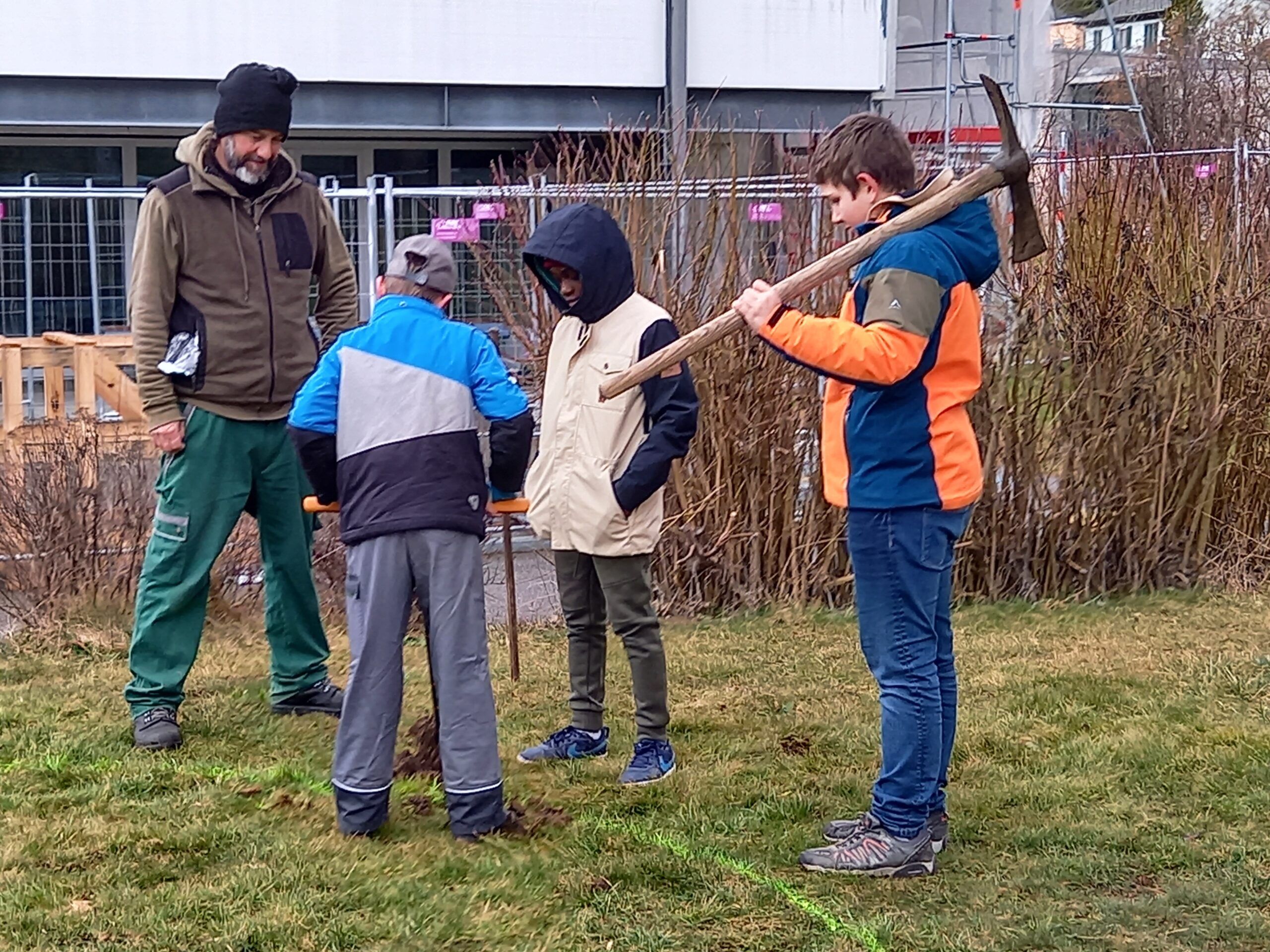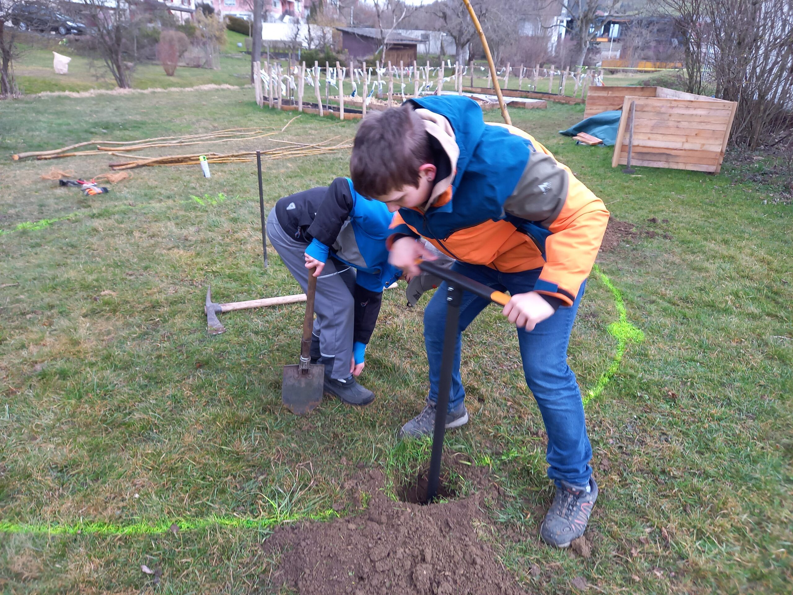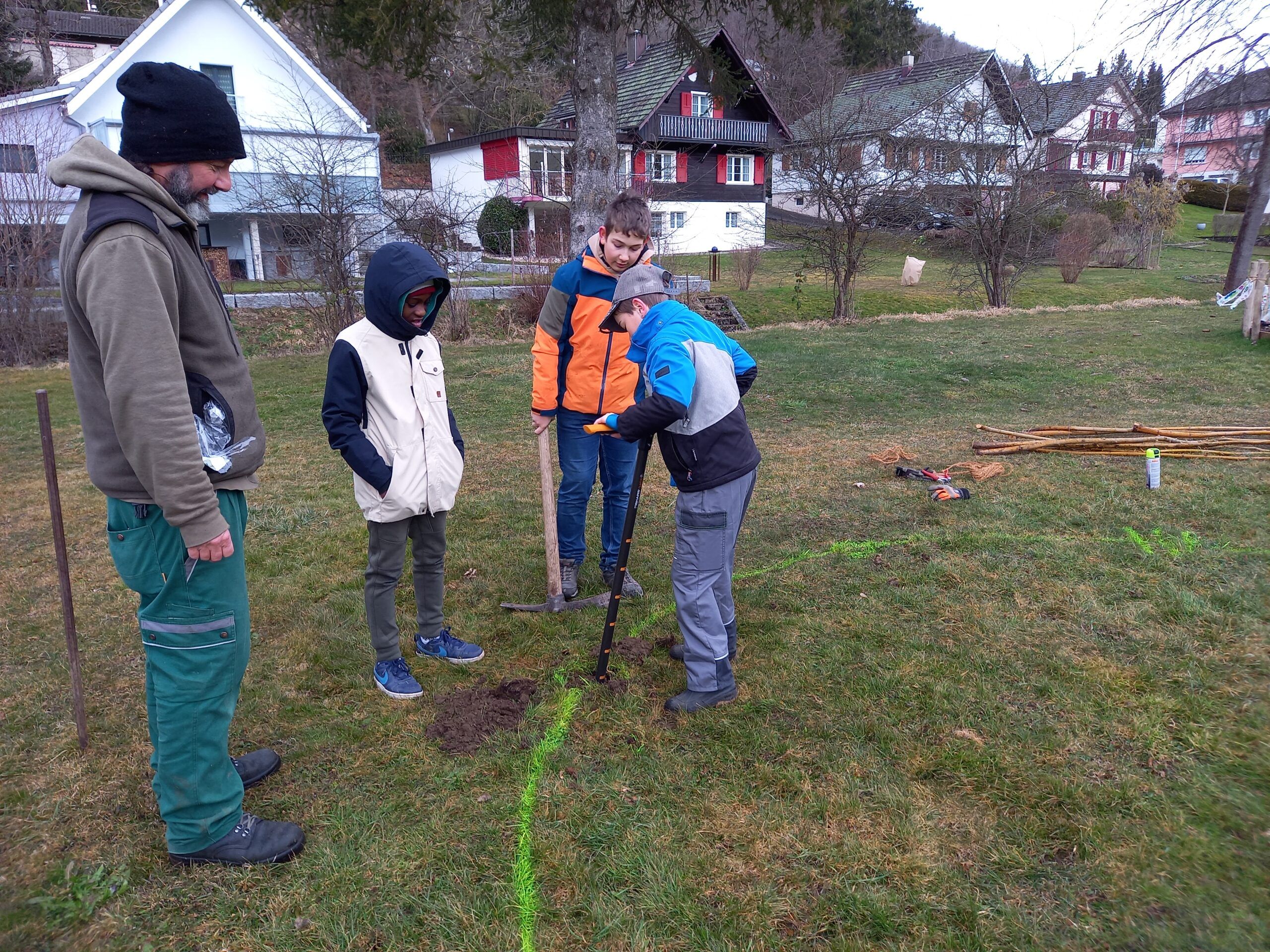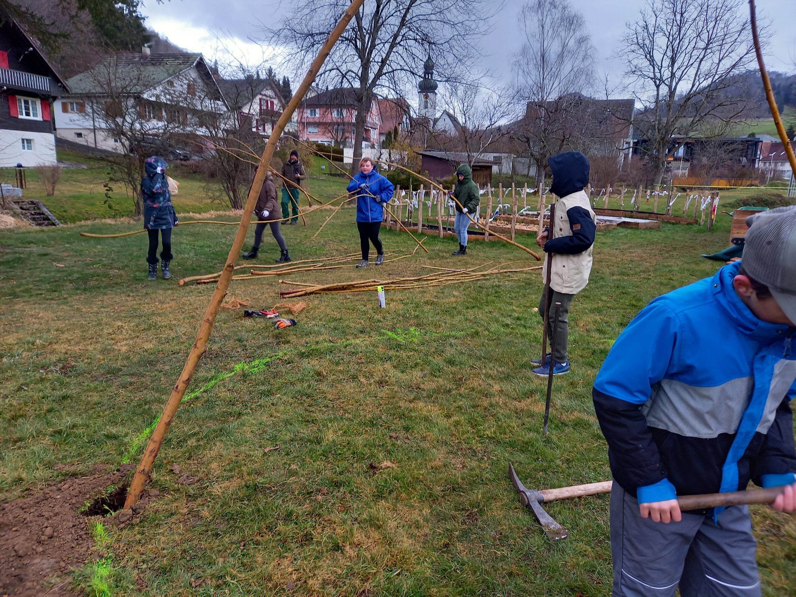 Nachdem der Standort des Weidehauses festgelegt war, wurden die Jungs der 4.-6. Klasse sogleich eingespannt. Mit einem grossen Handbohrer wurden tiefe Löcher gegraben, in welche die Weiden gesteckt wurden. Ganz schön anstrengend! Vor allem auch, weil das Wetter sich wieder von der schlechtesten Seite gezeigt hat. Trotz Wind und Regen packten nach der grossen Pause auch die Kleineren mit an. Es wurde Sommergerste gesät, Beete vorbereitet, gejätet, Steine gesammelt… Sogar ein früherer Plattenboden wurde gefunden. Hier entstand der Wunsch diesen wieder instand zu stellen und ein lauschiges Plätzli zu schaffen.