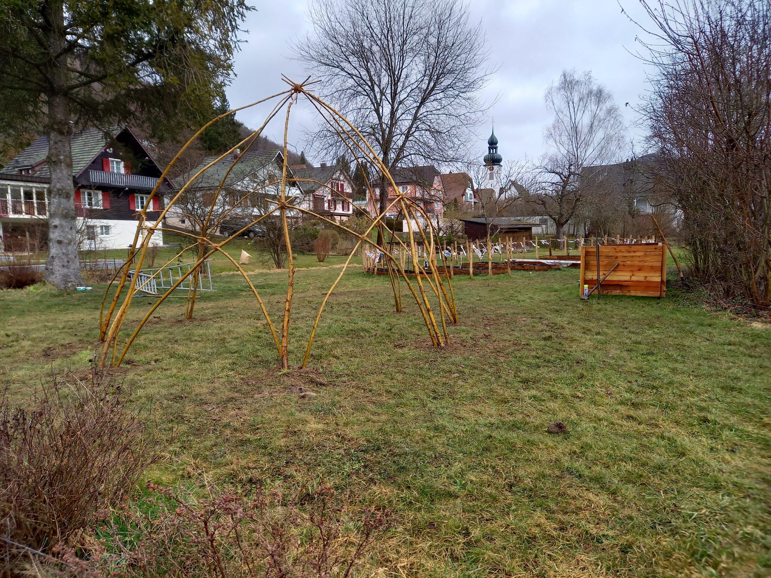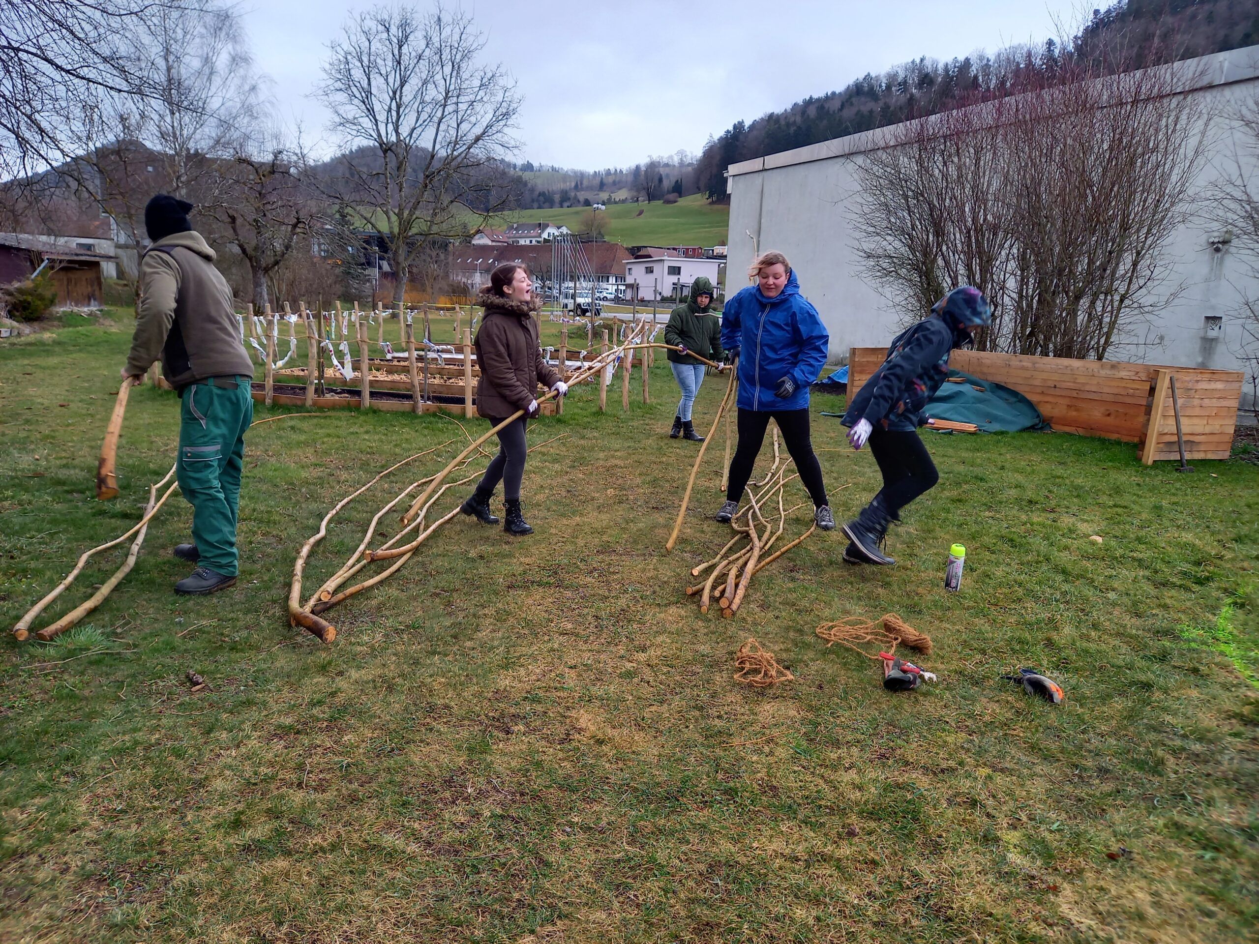 Heute besuchte uns Benedikt Bohren, eine Fachperson, welche mit uns das Weidehaus pflanzen wird. Der Anblick seines Autos war lustig. Die auf dem Autodach befestigten Weidestecken waren so lang, dass sie hinten und vorne herausragten.