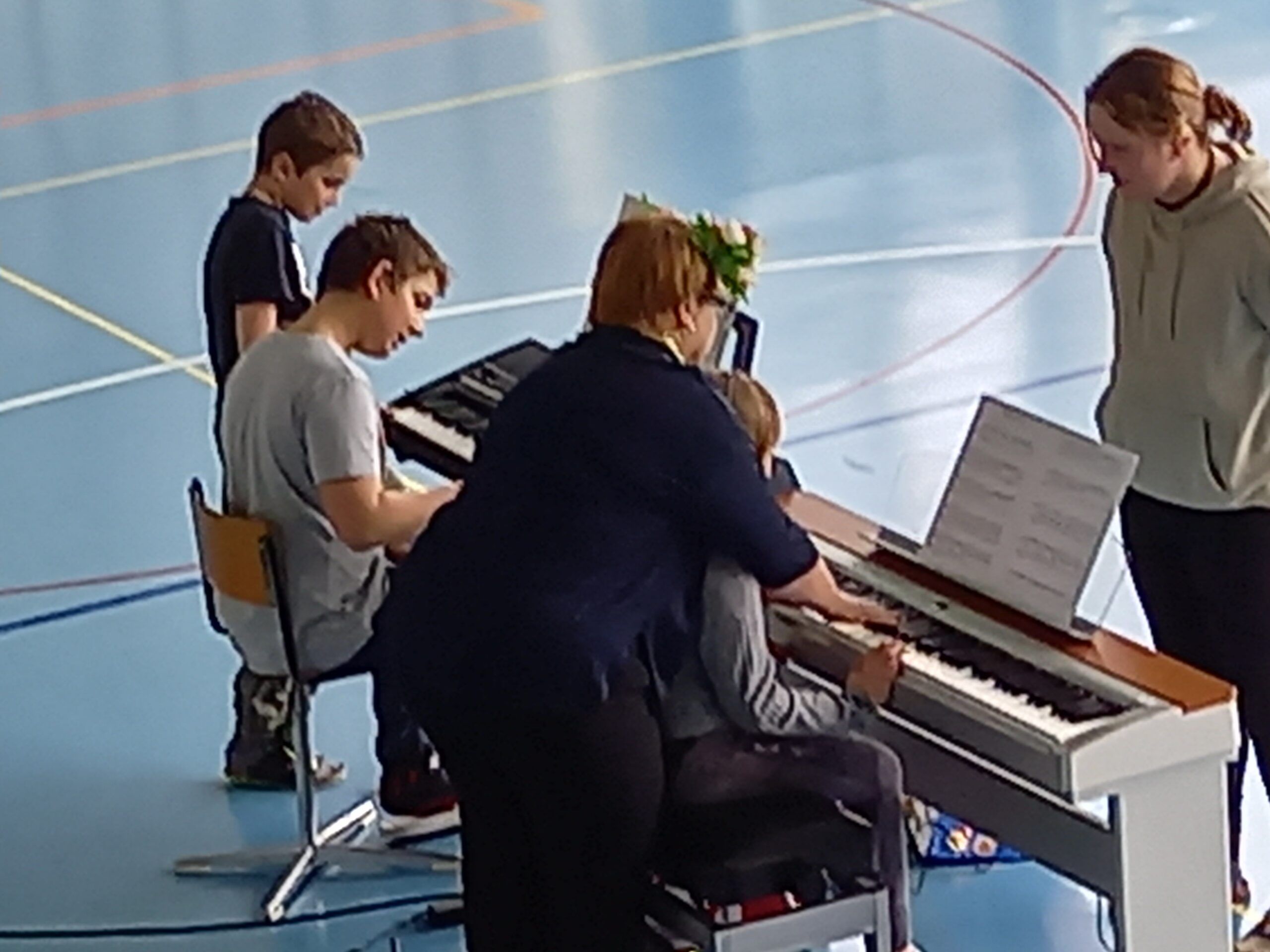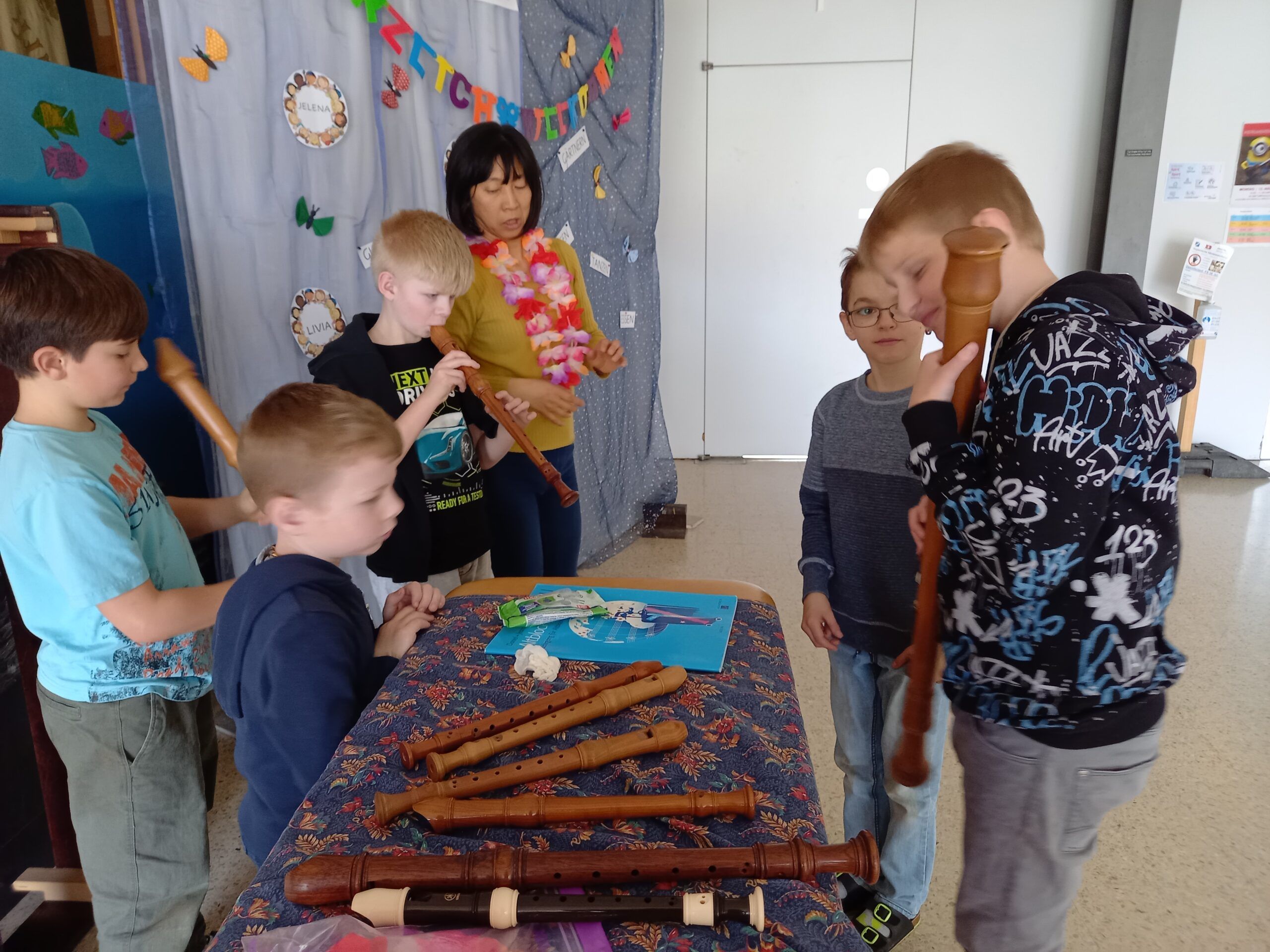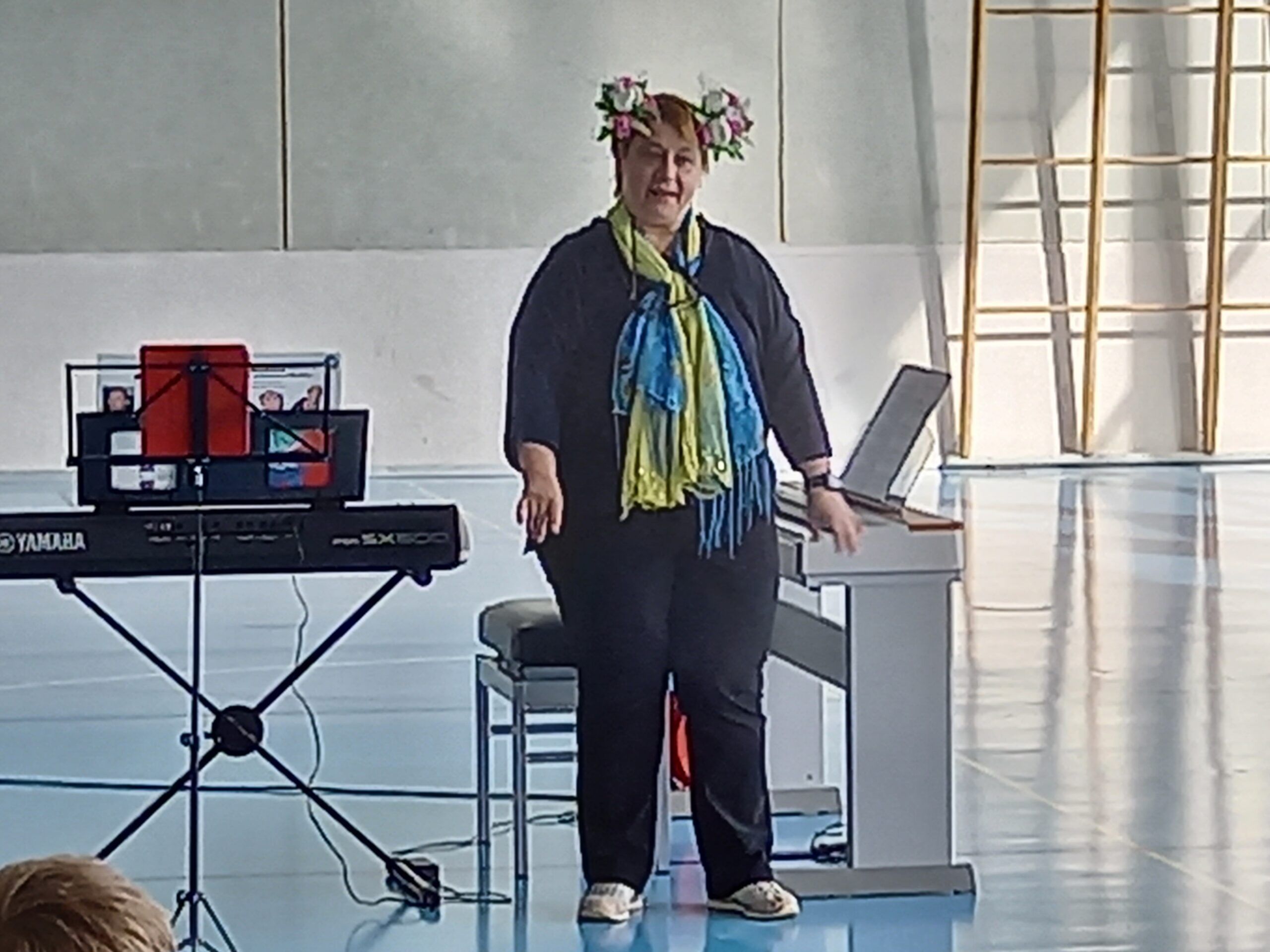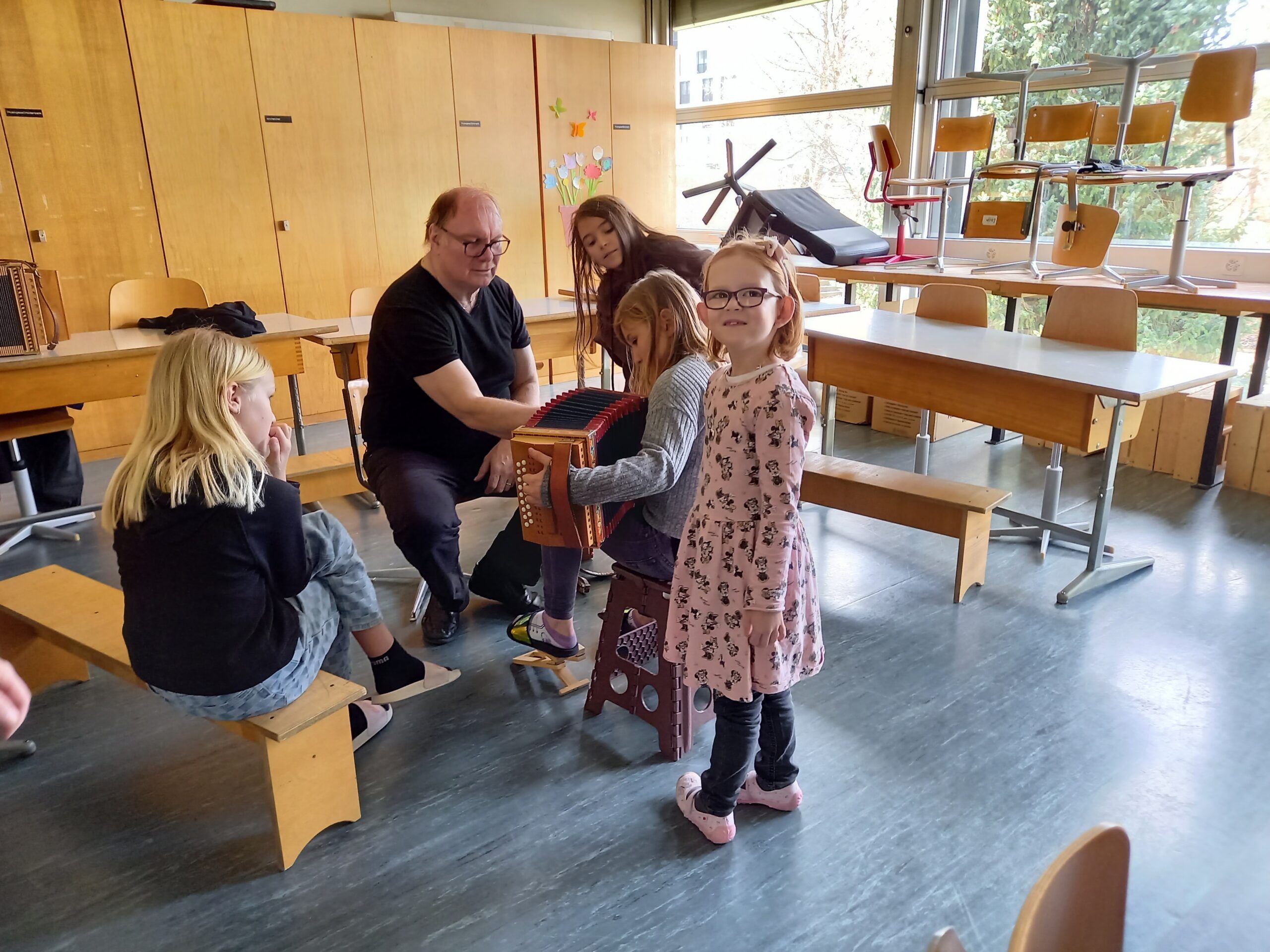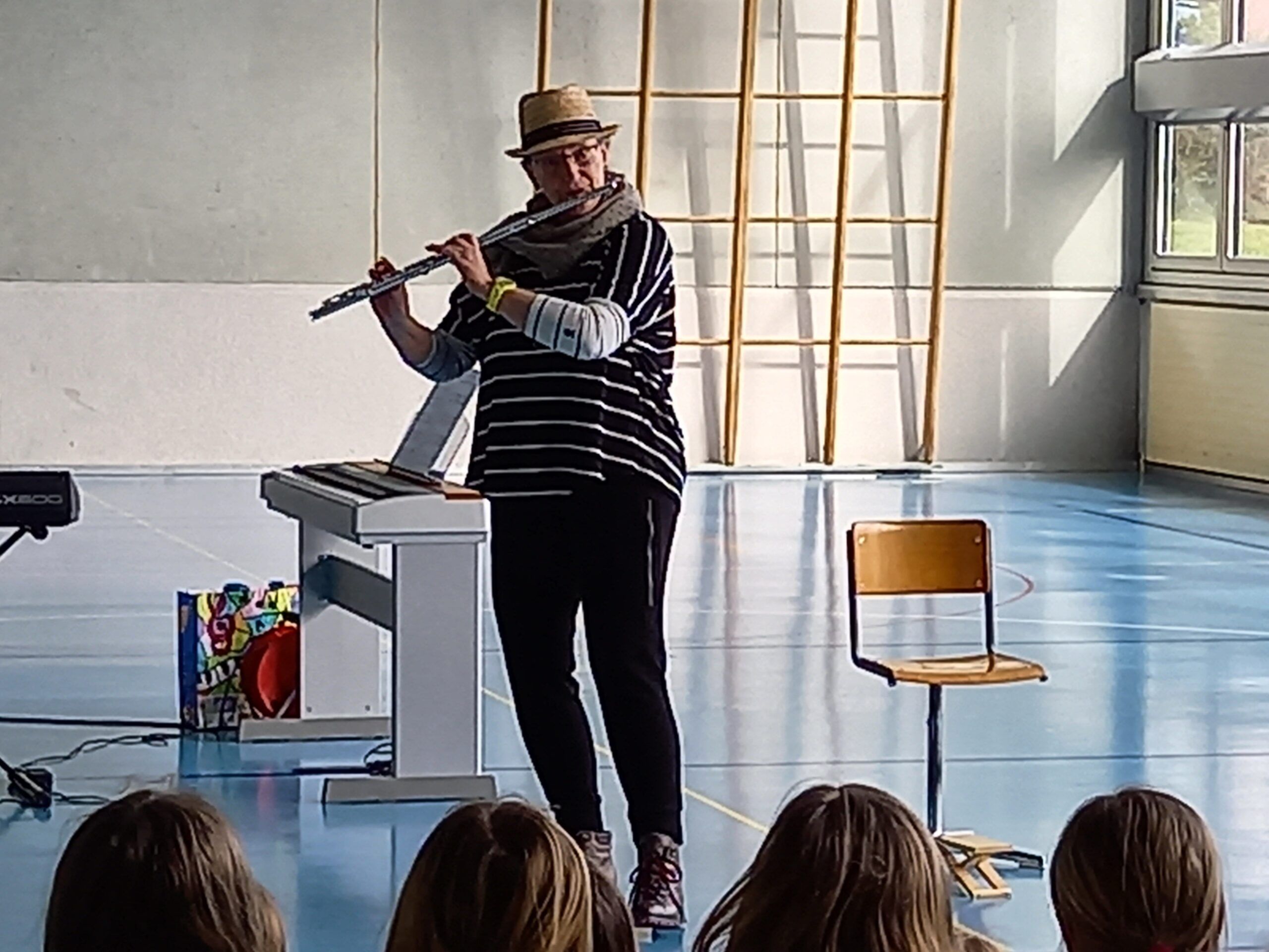 Roger Stöckli, der neue Musikschulpräsident, begrüsste die Kinder. Er stellte die Lehrpersonen der Musikschule mit einer gelungenen Einlage vor. Er beamte jeweils eine Lehrperson in die Turnhalle, worauf diese sich und ihr Instrument vorstellte. Gross und klein gefiel es und alle hatten Spass. Nach dieser Vorstellung durften die Kinder die Instrumente noch selbst in verschiedenen Räumen ausprobieren.
