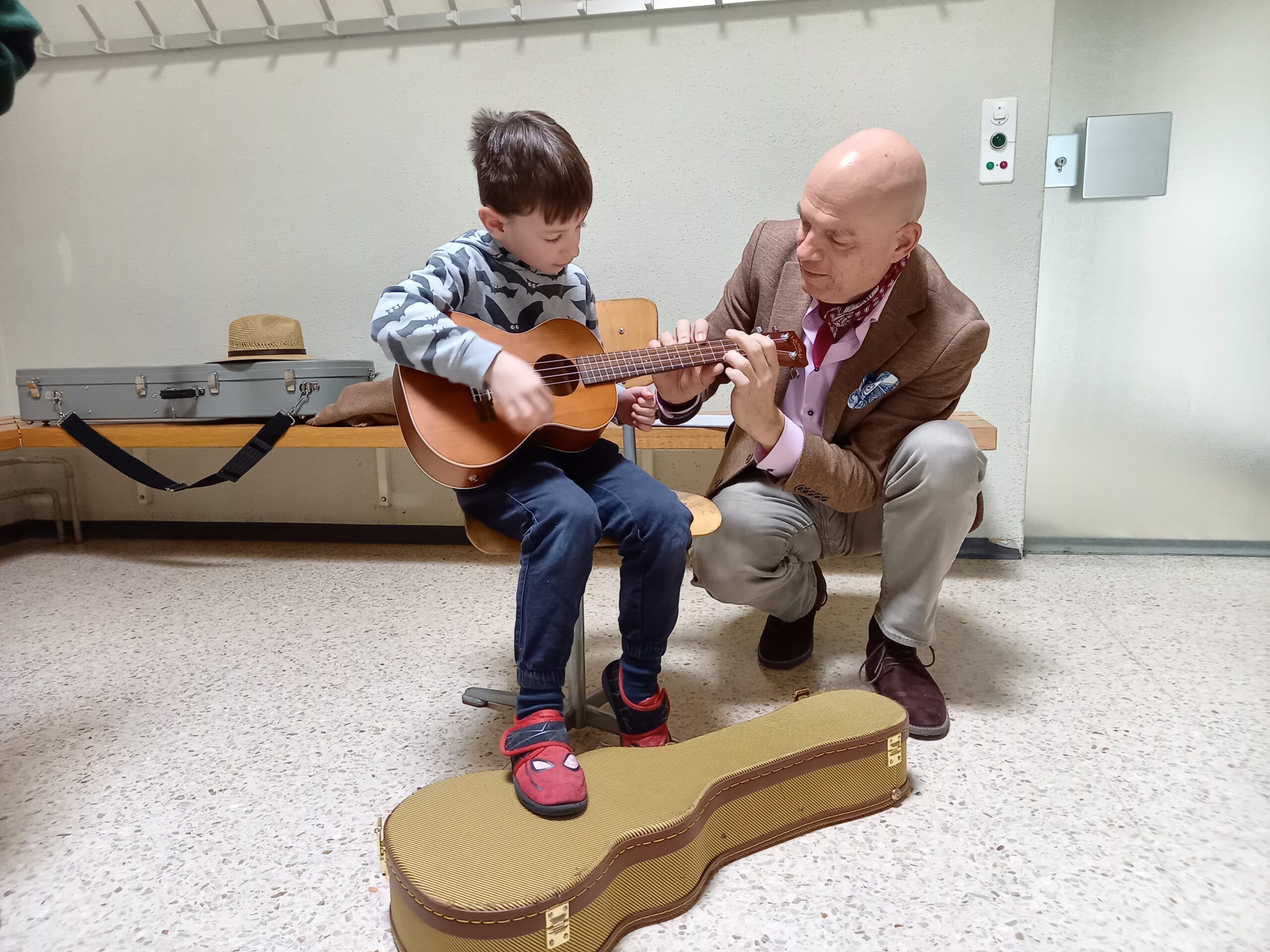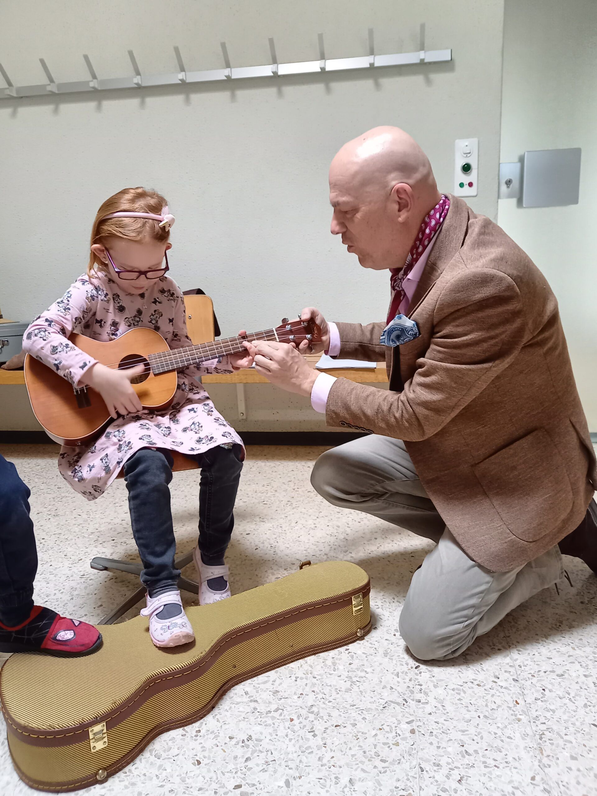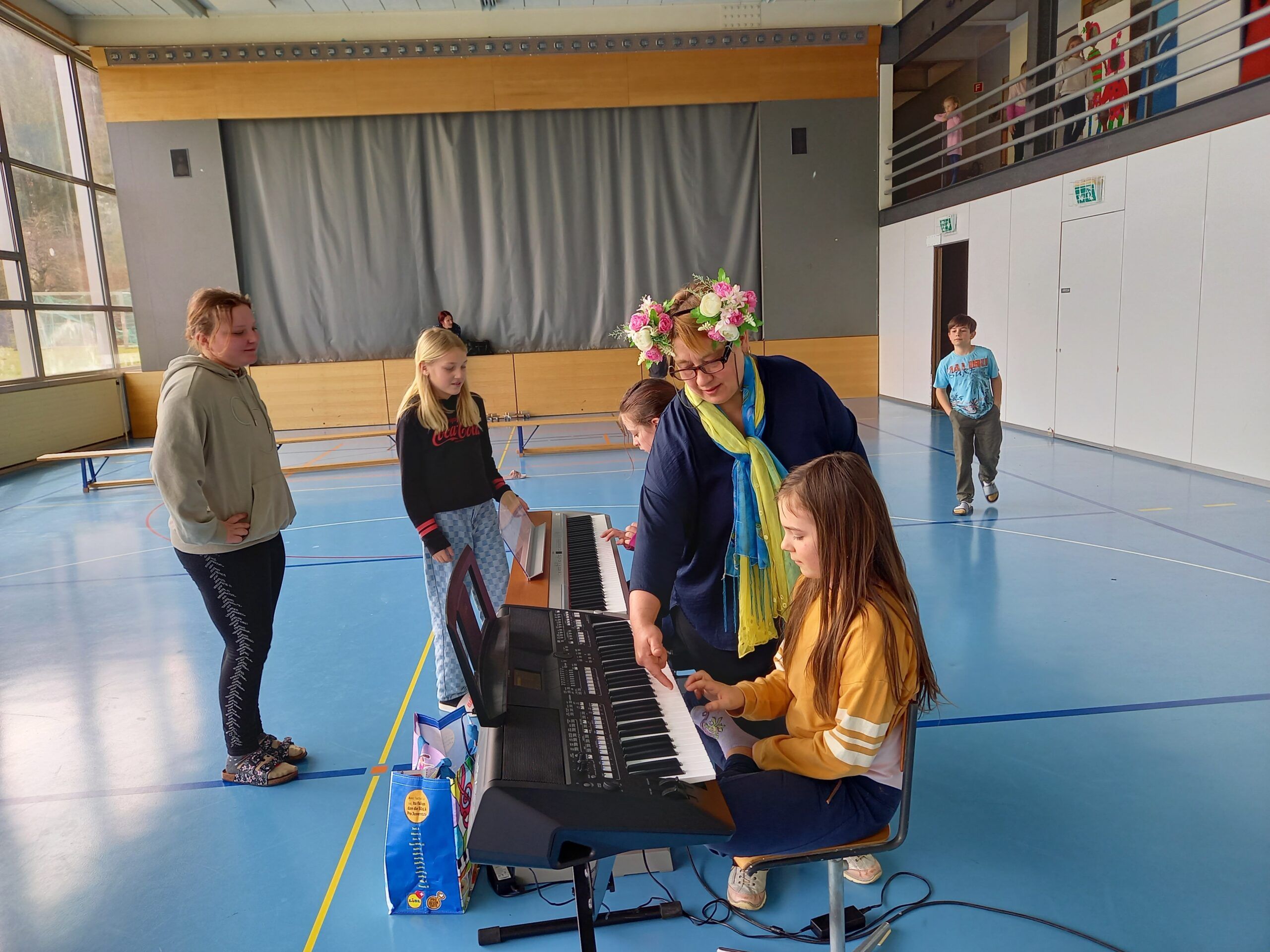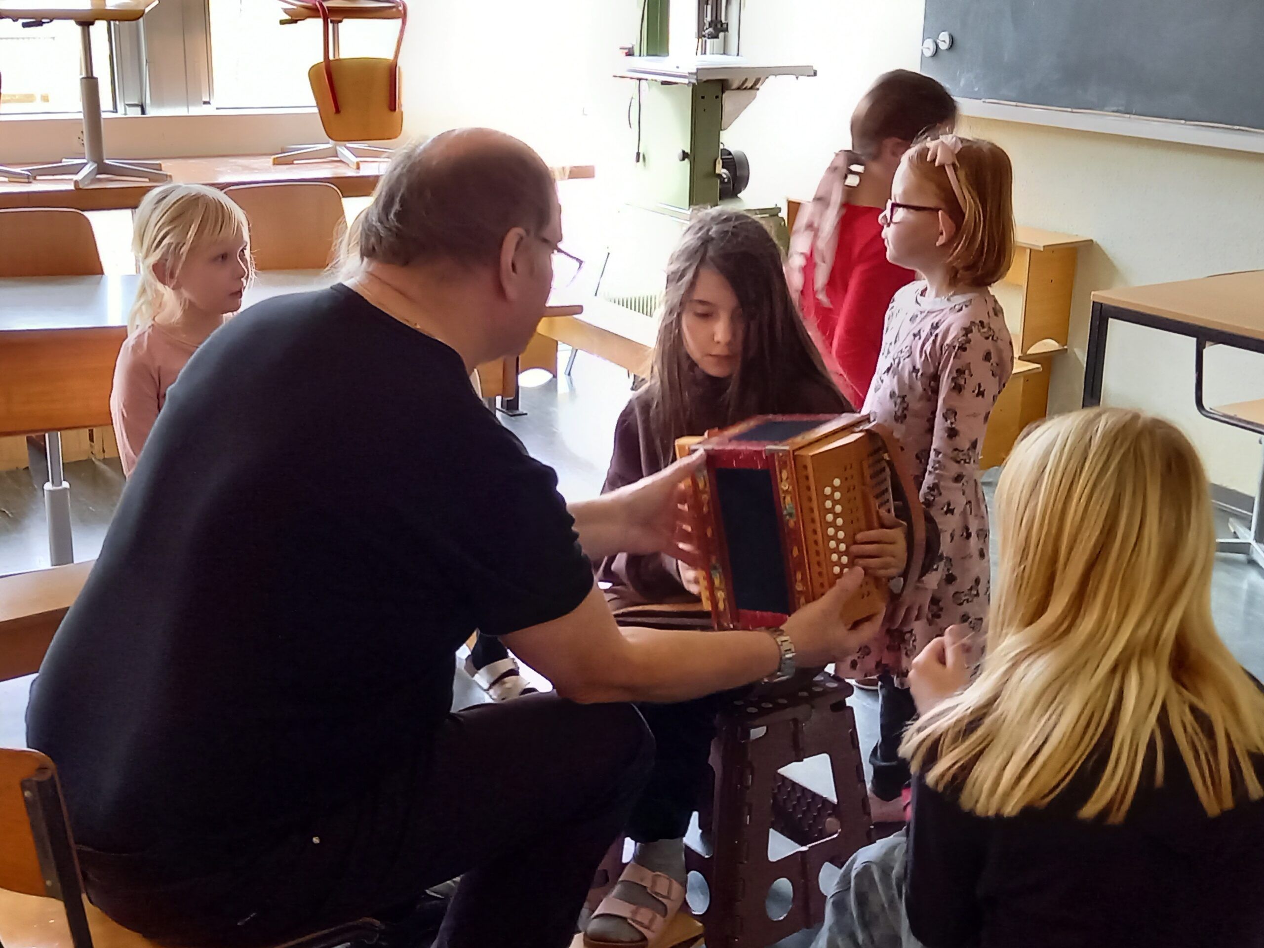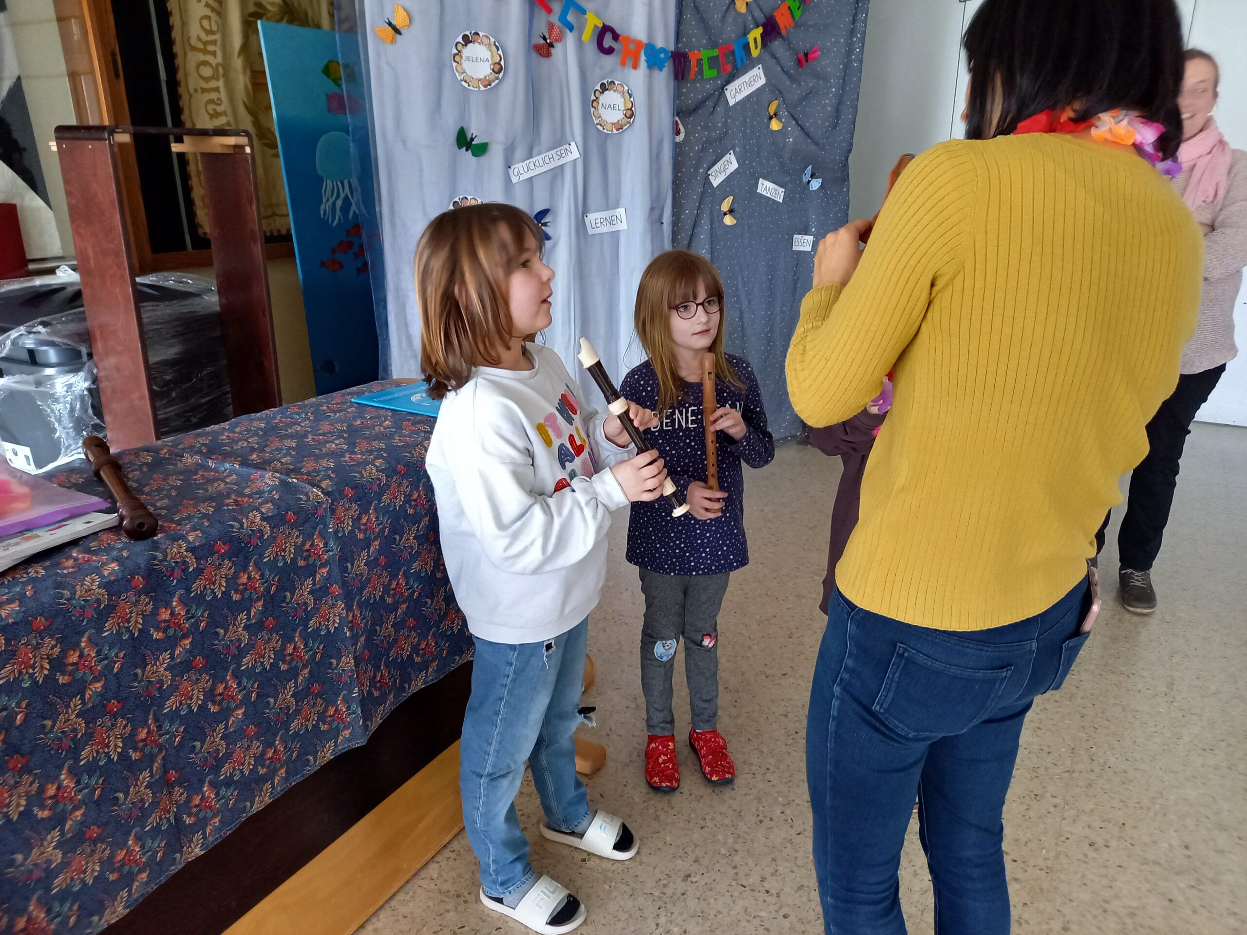 Roger Stöckli, der neue Musikschulpräsident, begrüsste die Kinder. Er stellte die Lehrpersonen der Musikschule mit einer gelungenen Einlage vor. Er beamte jeweils eine Lehrperson in die Turnhalle, worauf diese sich und ihr Instrument vorstellte. Gross und klein gefiel es und alle hatten Spass. Nach dieser Vorstellung durften die Kinder die Instrumente noch selbst in verschiedenen Räumen ausprobieren.