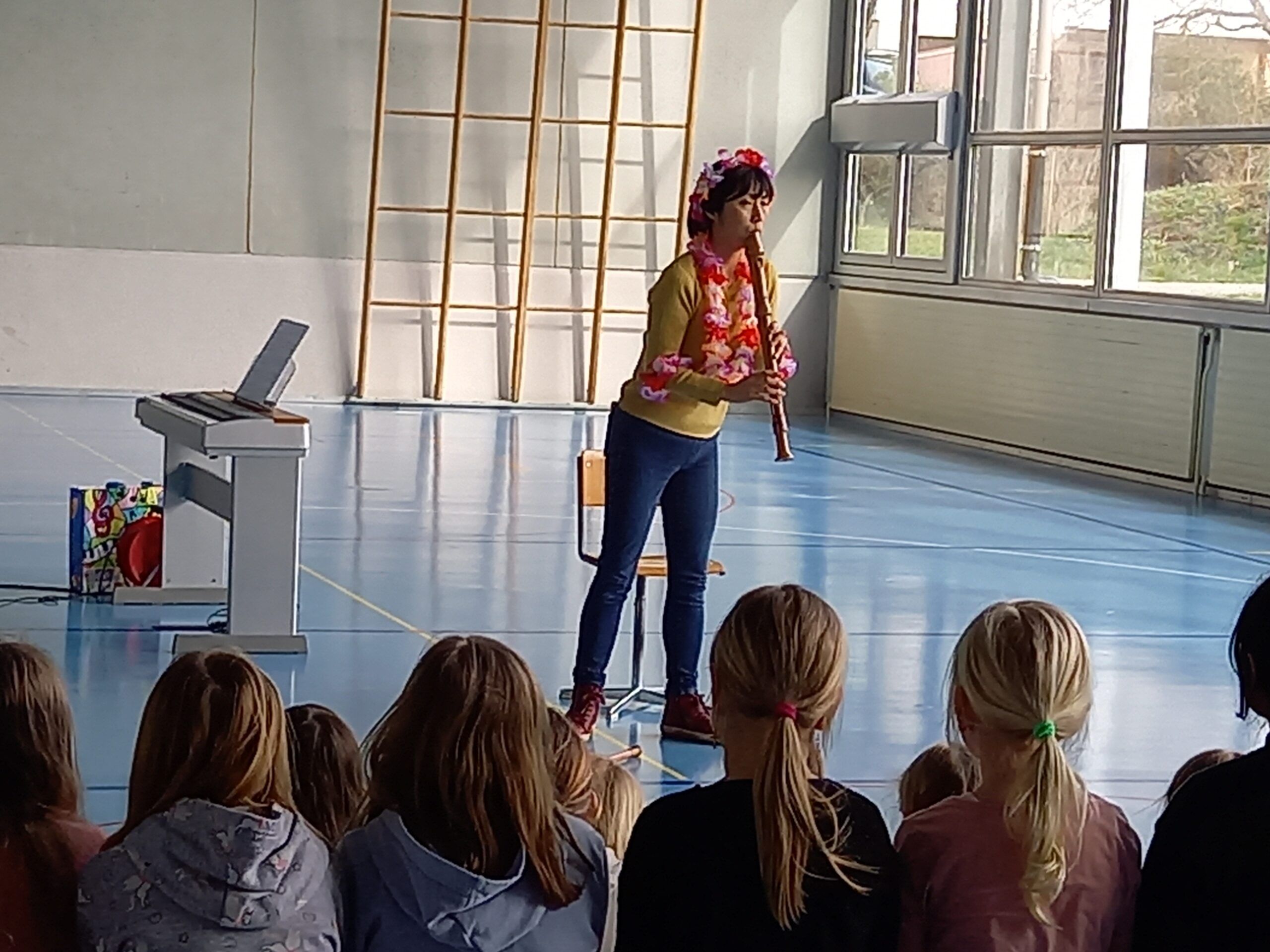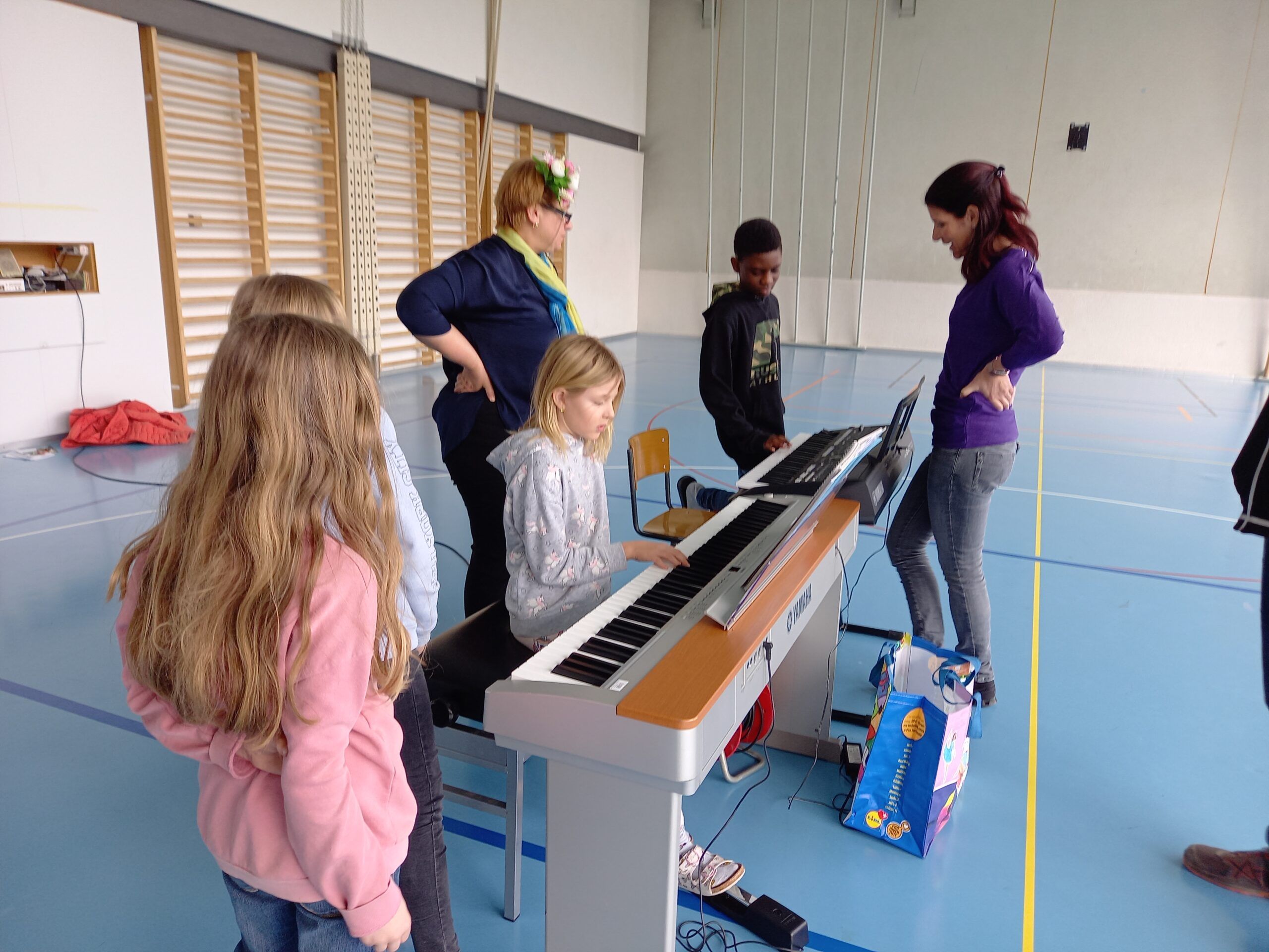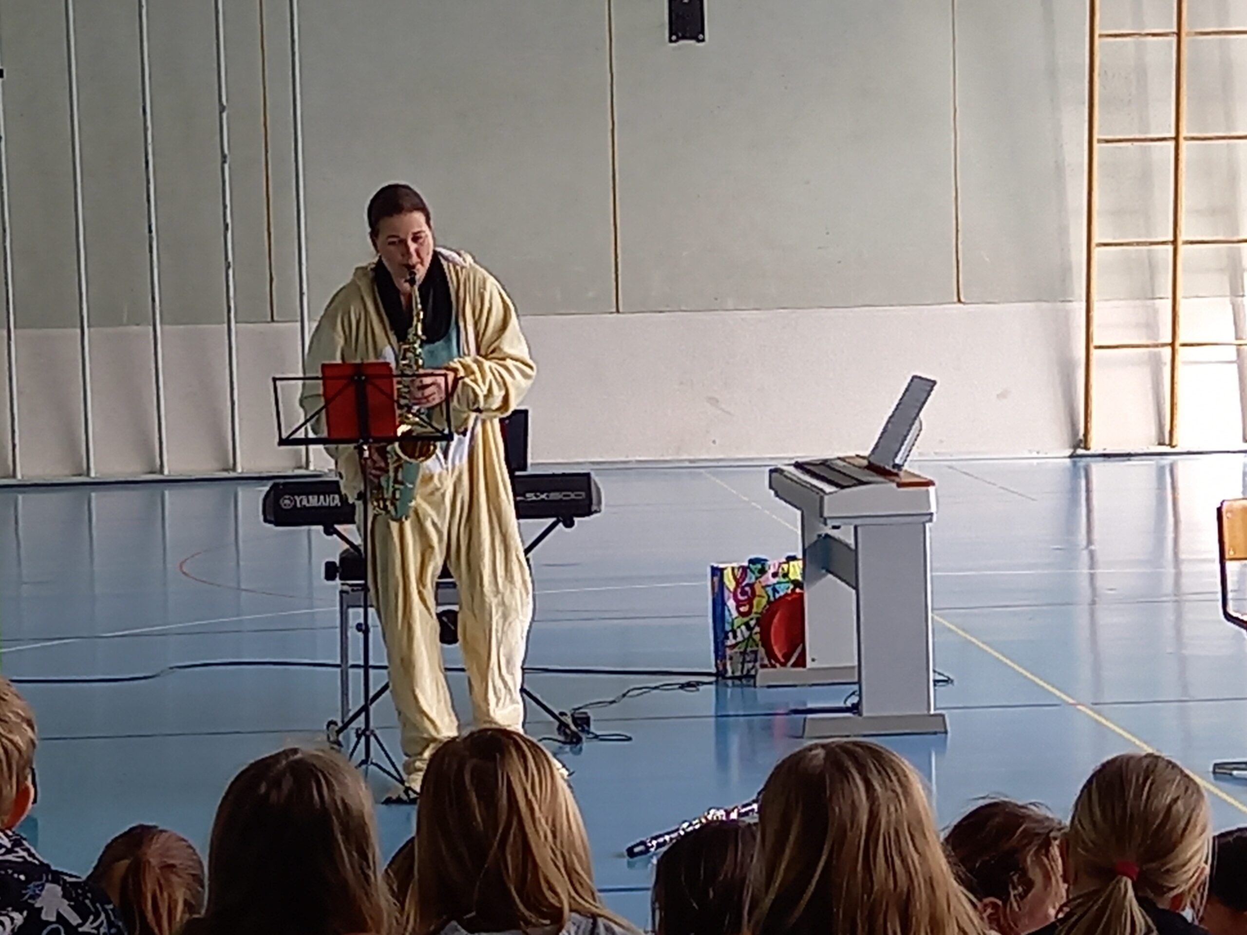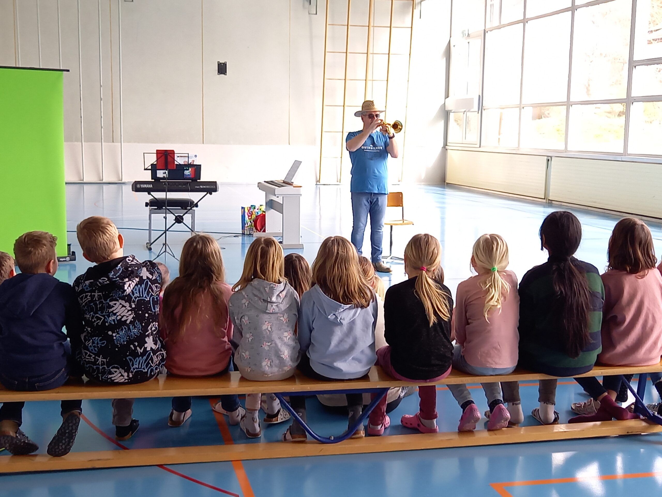 Heute konnte die Musikschule ihr Angebot in der Turnhalle den Kindern des grossen Kindergartens bis zur 6. Klasse vorstellen.