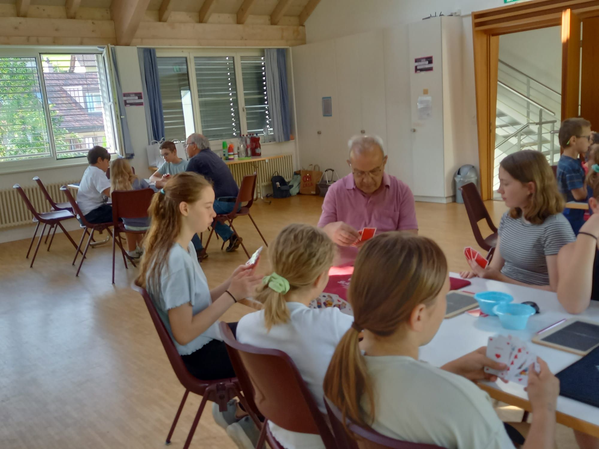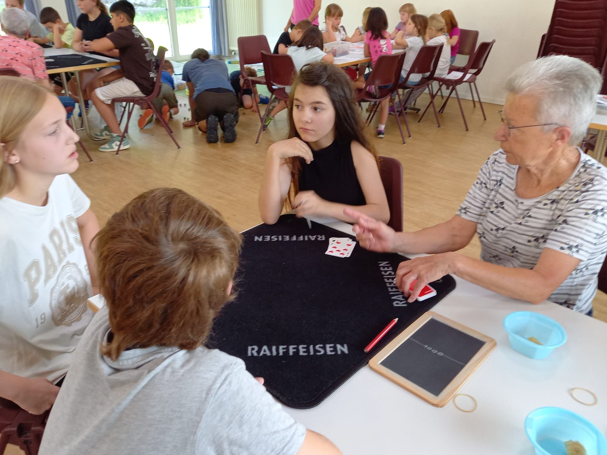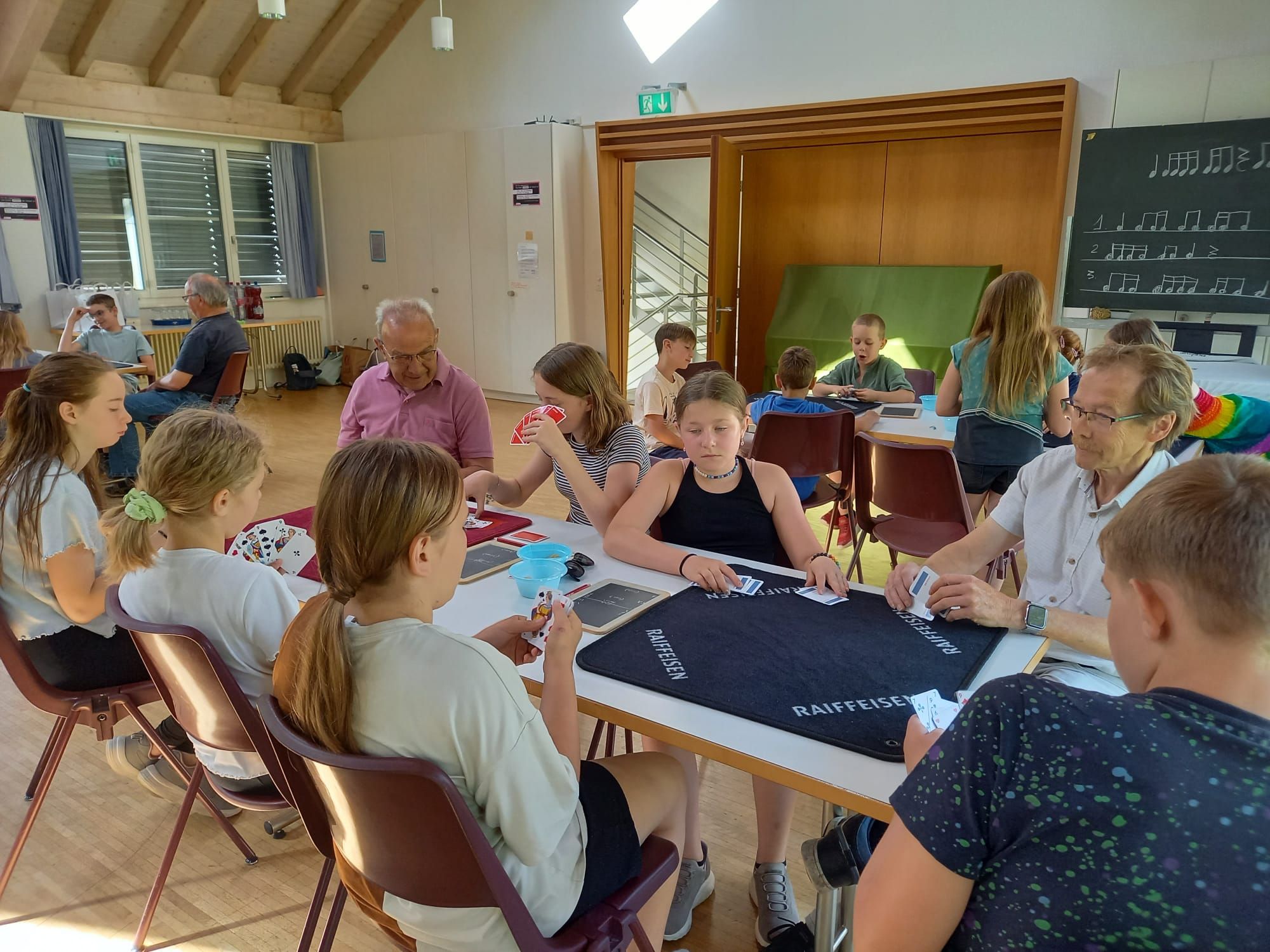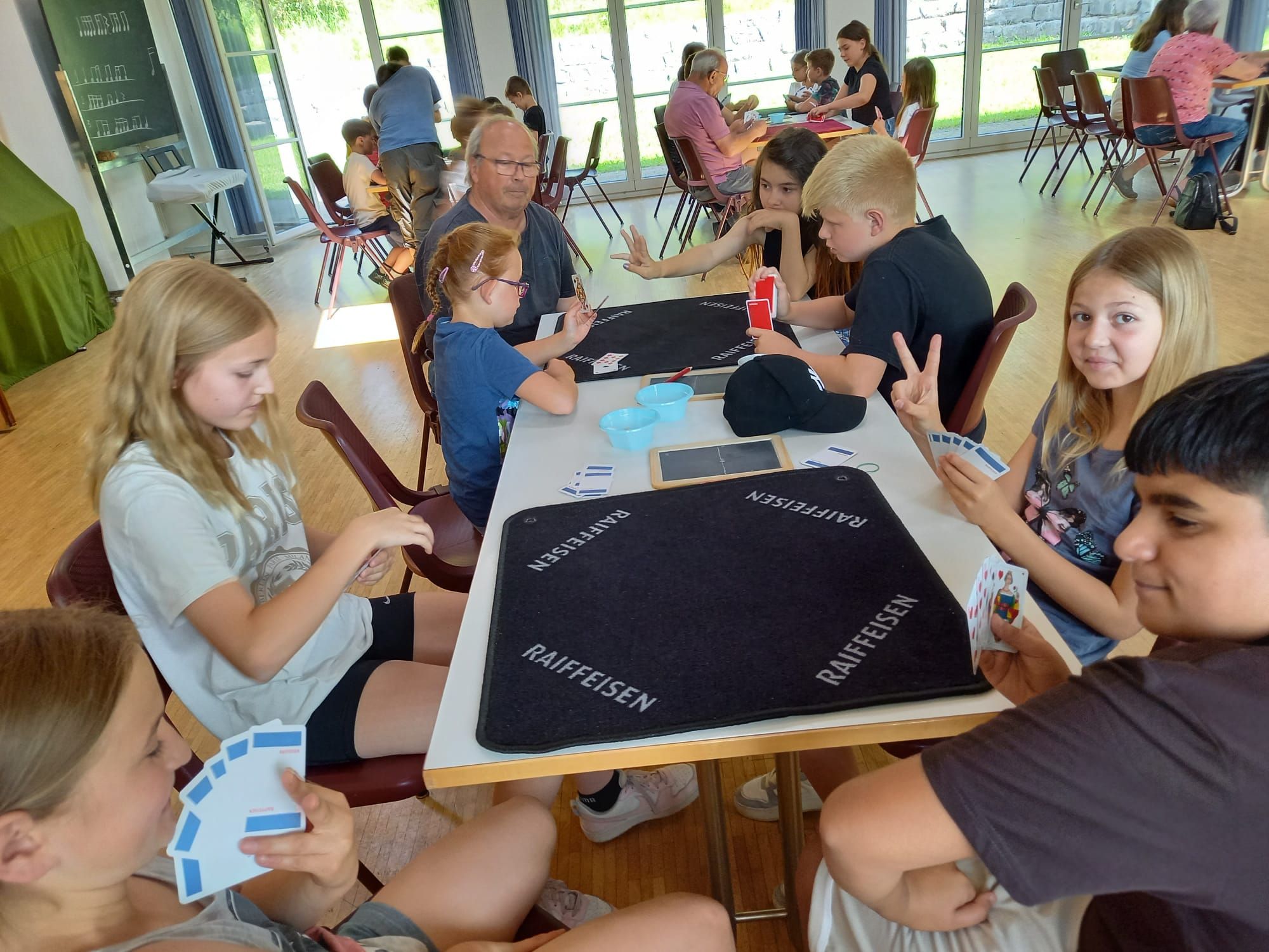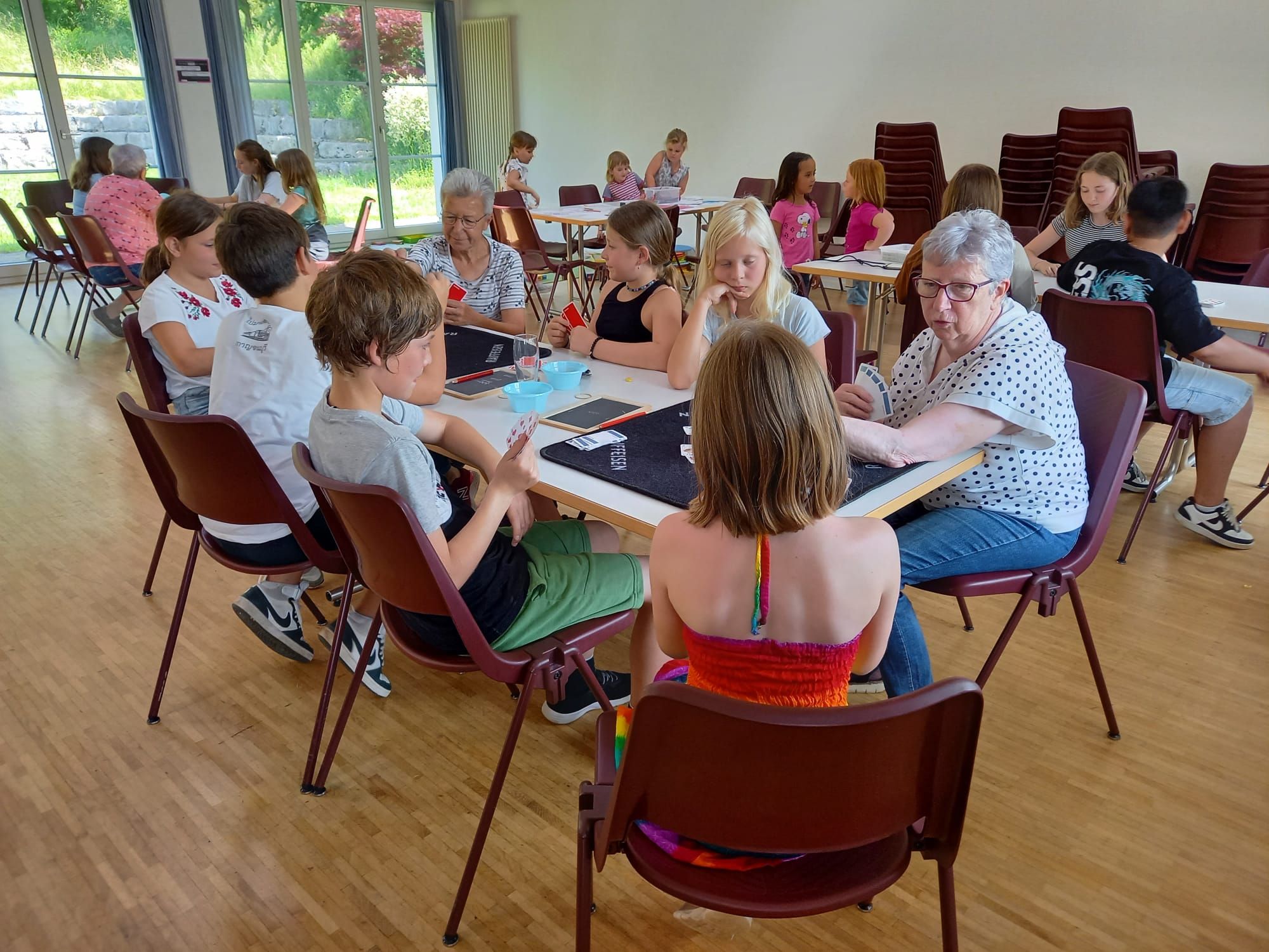 In der diesjährigen Projektwoche, die vom 10. bis 13. Juni ging, haben wir das Jassen erlernt. Mit drei großartigen und abwechslungsreichen Ateliers machte die Projektwoche einen grossen Spass. Zuerst sangen wir die Schulschluss – Lieder und danach wurden wir in drei Gruppen aufgeteilt, da wir sonst viel zu viele Kinder gewesen wären. In einem der Ateliers haben wir die Blumentöpfe bemalt, welche am Schulschlussfest als Dekoration auf den Tischen stehen werden und wir haben auch die Fahnen mit unseren Händen bedruckt. Diese Fahnen werden draussen beim Spielplatz stehen. Dieses Atelier leitete Frau Nussbaumer und Herr Wyss. Das zweite wurde von Frau Jäggi und Frau Müller geleitet. Da verfeinerten wir unsere Jass – Künste und lernten die Jass – Punkte auf der Tafel aufzuschreiben. Das letzte Atelier war bei Frau Henz und Frau Allenspach. Dort machten wir ein Jasskarten – Etui und wir filzten ein Zeichen unserer Wahl darauf. Natürlich unterstützten die Grösseren die Kleineren. Am Freitag krönten wir unsere Projektwoche mit einem Jass – Morgen, an welchem einige SeniorInnen aus dem Dorf teilnahmen. Am Mittag gab es sehr leckere Nudeln mit Tomatensauce. Danach ging es ins schöne, heisse Wochenende.