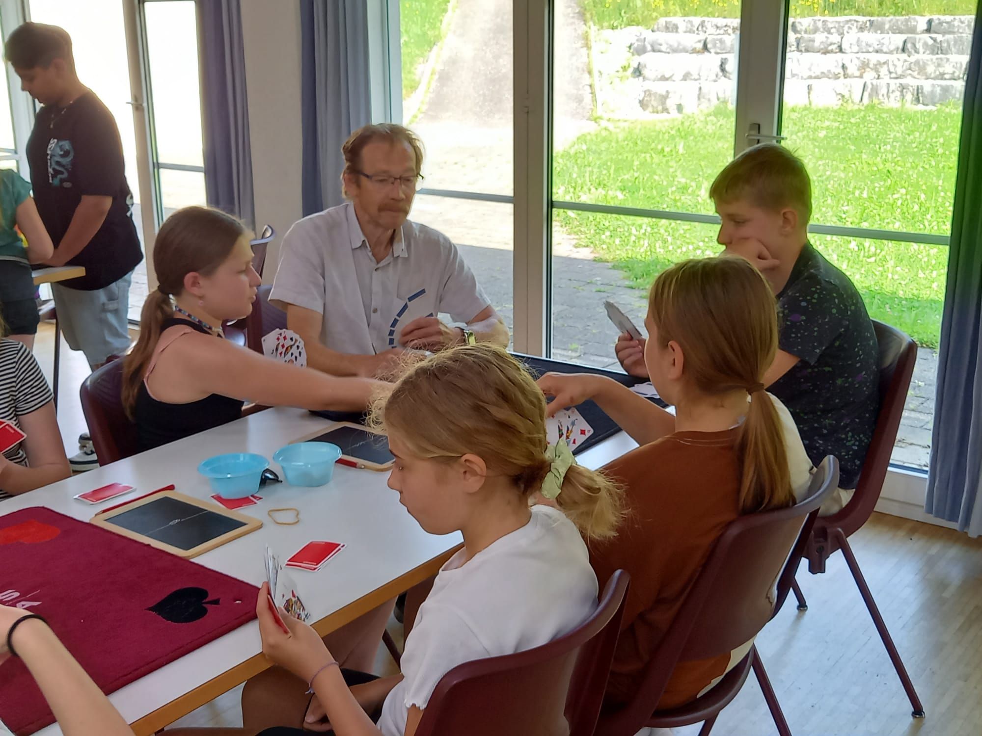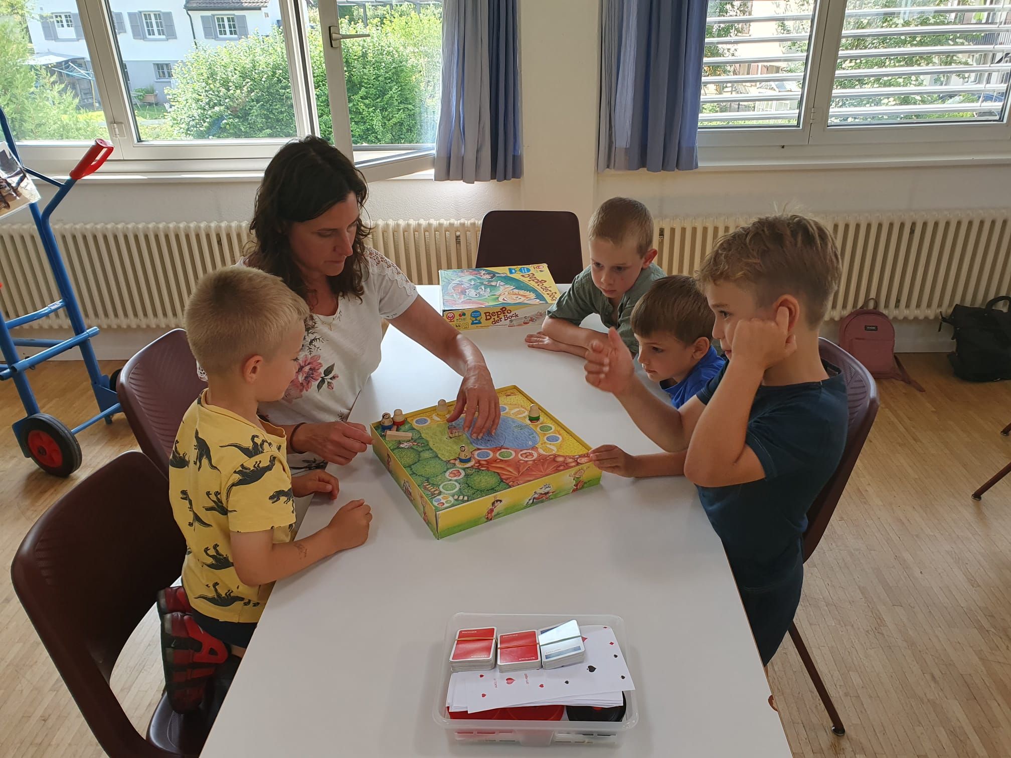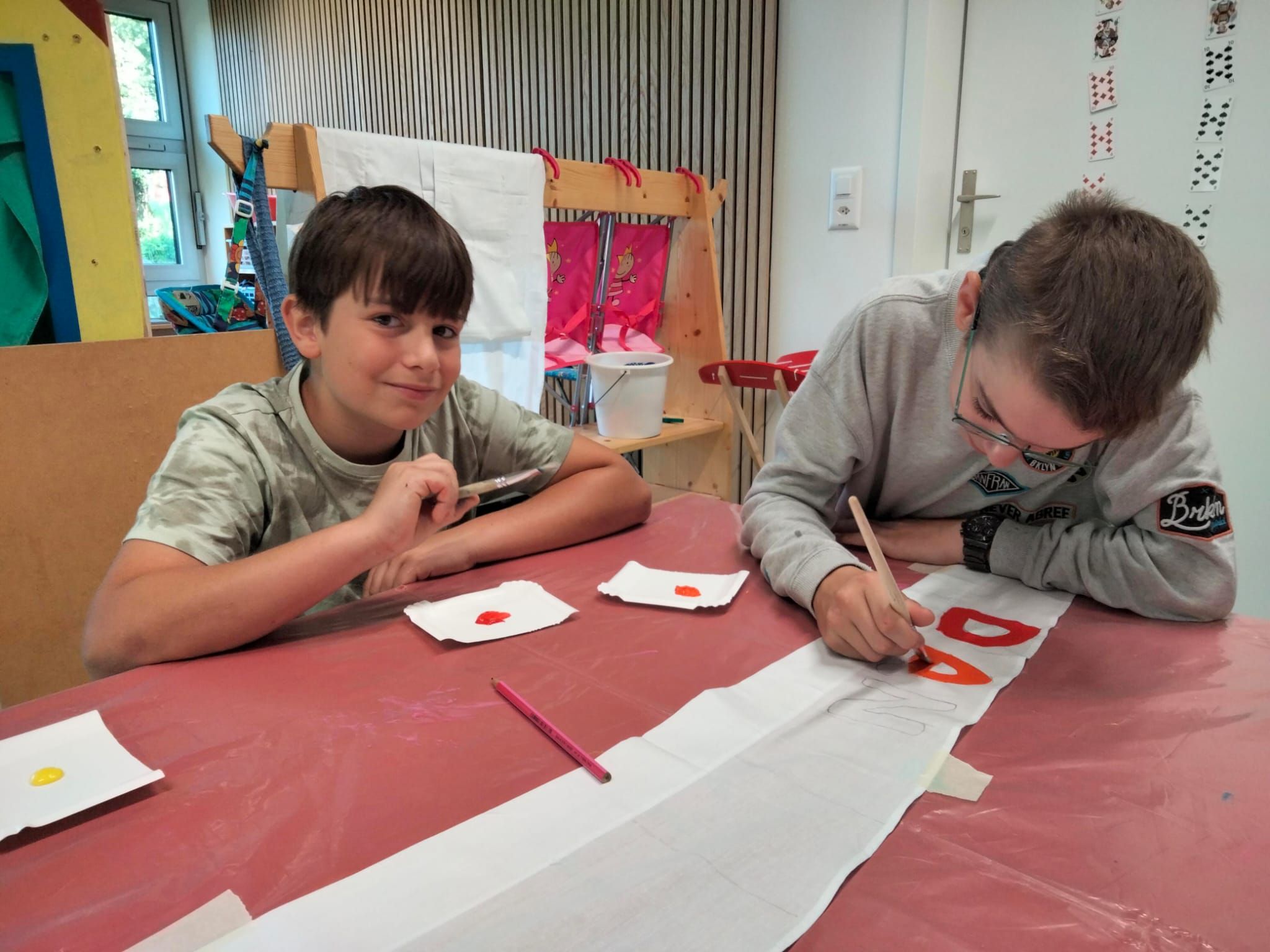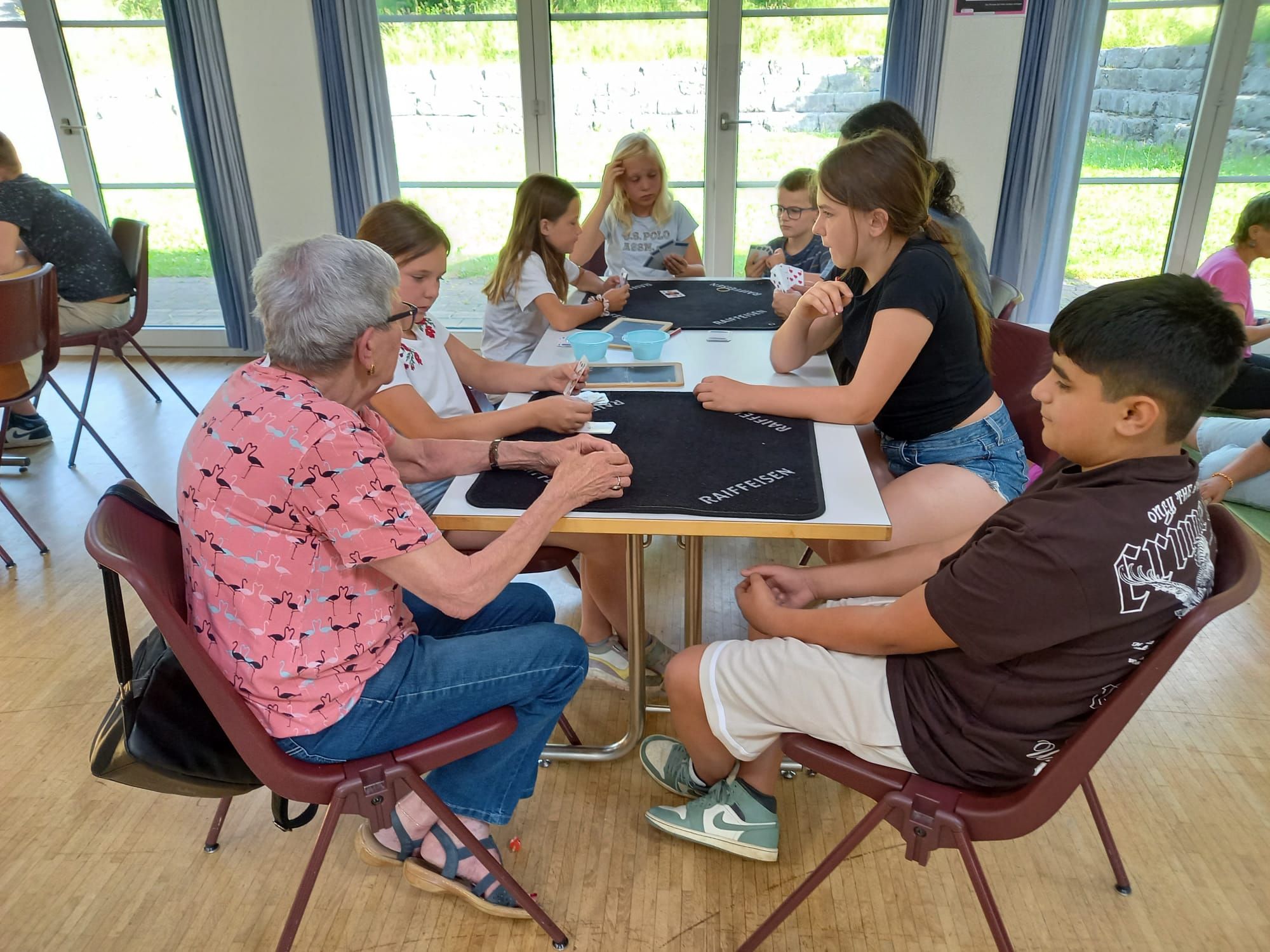 In der diesjährigen Projektwoche, die vom 10. bis 13. Juni ging, haben wir das Jassen erlernt. Mit drei großartigen und abwechslungsreichen Ateliers machte die Projektwoche einen grossen Spass. Zuerst sangen wir die Schulschluss – Lieder und danach wurden wir in drei Gruppen aufgeteilt, da wir sonst viel zu viele Kinder gewesen wären. In einem der Ateliers haben wir die Blumentöpfe bemalt, welche am Schulschlussfest als Dekoration auf den Tischen stehen werden und wir haben auch die Fahnen mit unseren Händen bedruckt. Diese Fahnen werden draussen beim Spielplatz stehen. Dieses Atelier leitete Frau Nussbaumer und Herr Wyss. Das zweite wurde von Frau Jäggi und Frau Müller geleitet. Da verfeinerten wir unsere Jass – Künste und lernten die Jass – Punkte auf der Tafel aufzuschreiben. Das letzte Atelier war bei Frau Henz und Frau Allenspach. Dort machten wir ein Jasskarten – Etui und wir filzten ein Zeichen unserer Wahl darauf. Natürlich unterstützten die Grösseren die Kleineren. Am Freitag krönten wir unsere Projektwoche mit einem Jass – Morgen, an welchem einige SeniorInnen aus dem Dorf teilnahmen. Am Mittag gab es sehr leckere Nudeln mit Tomatensauce. Danach ging es ins schöne, heisse Wochenende.