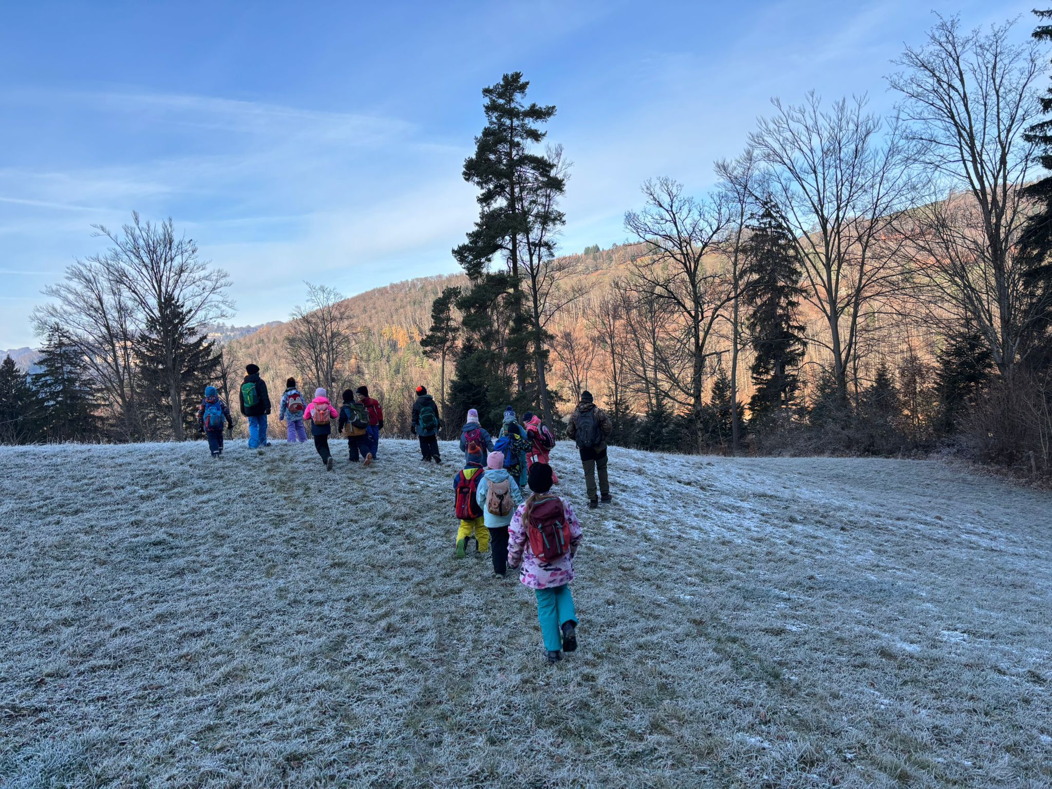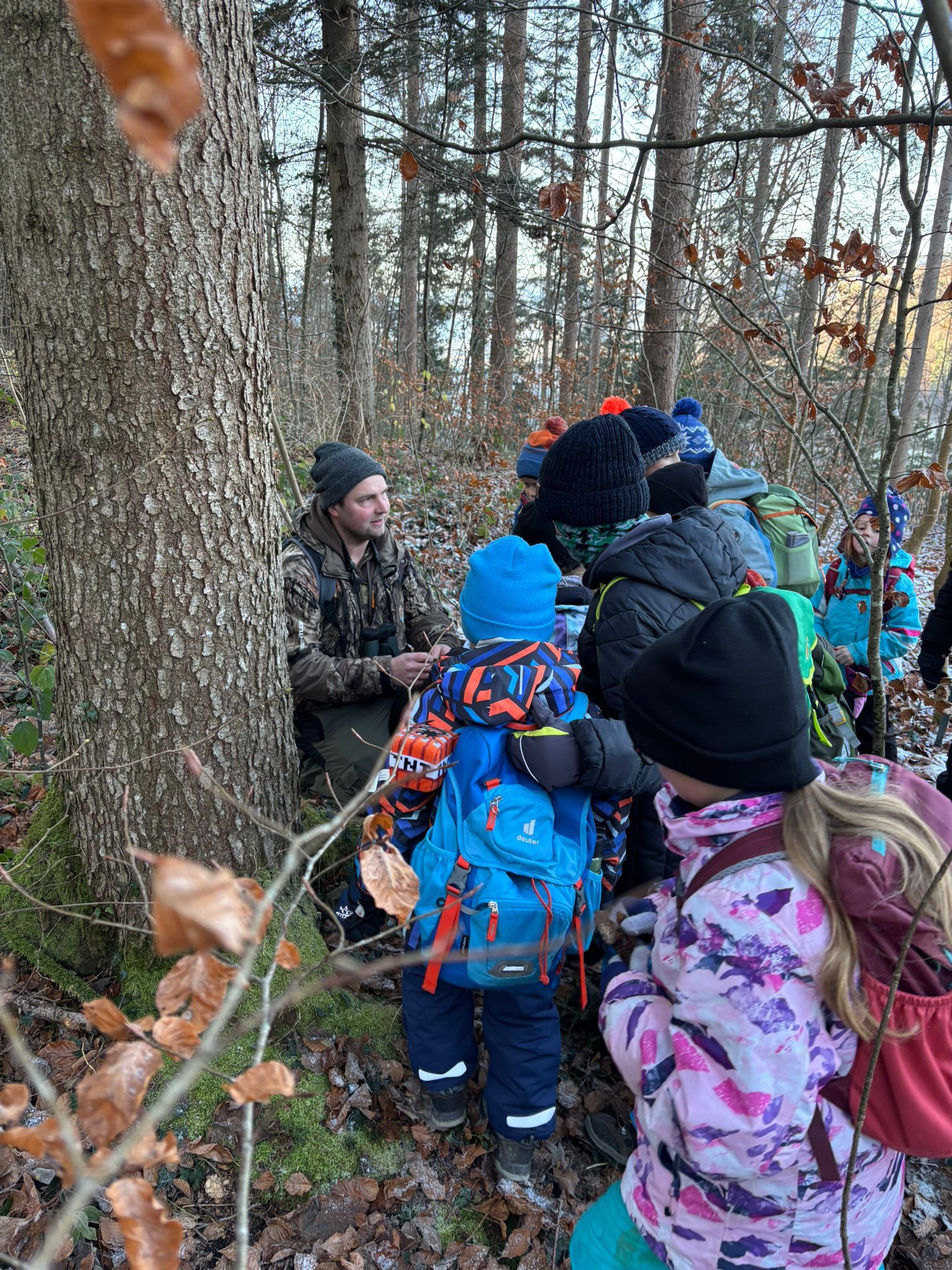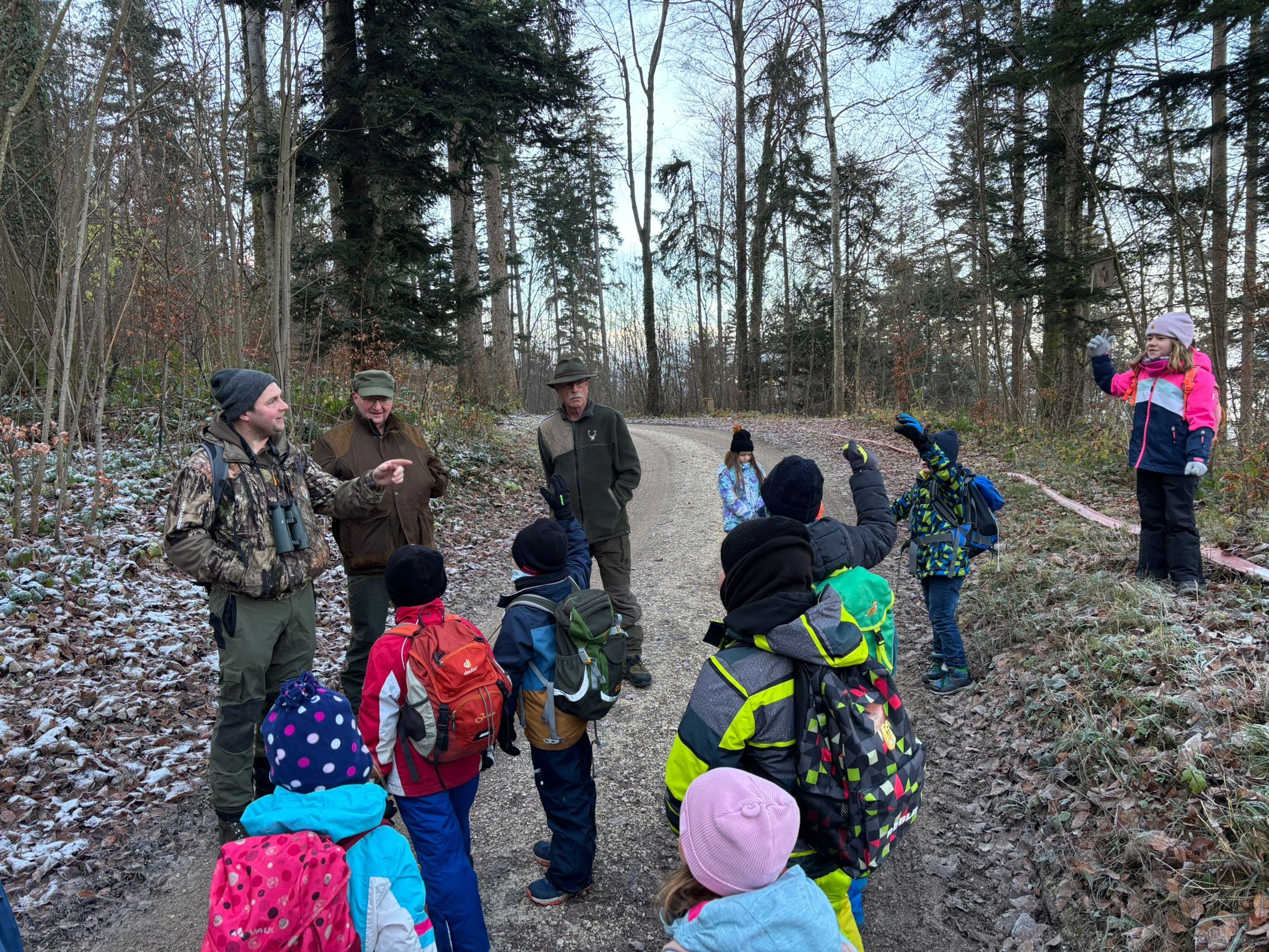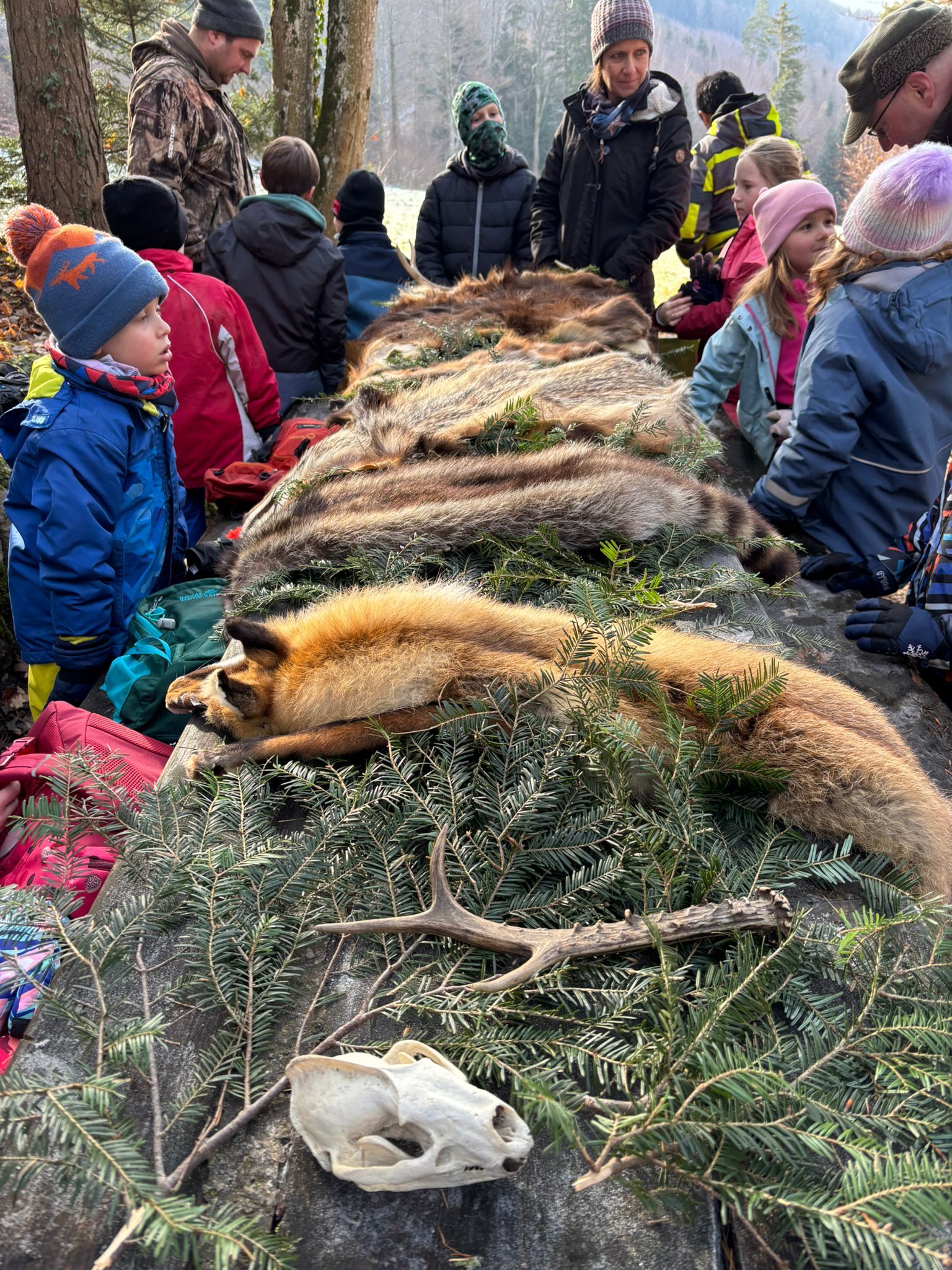 Die Schulkinder der ersten bis dritten Klasse erlebten einen lehrreichen Vormittag im Wald, begleitet von mehreren Jägern, welche den Kindern die spannende Welt der Wildtiere näherbrachten. Bereits zu Beginn machten sich die Schülerinnen und Schüler auf Spurensuche und entdeckten dabei angepickte Tannenzapfen und gut versteckte Nester der Eichhörnchen. Auf dem Waldboden fanden die Kinder ausserdem frische Spuren von Wildschweinen und Rehen, die der Jäger fachkundig erklärte. Ein weiteres Highlight war das Besichtigen eines Dachsbaues.
