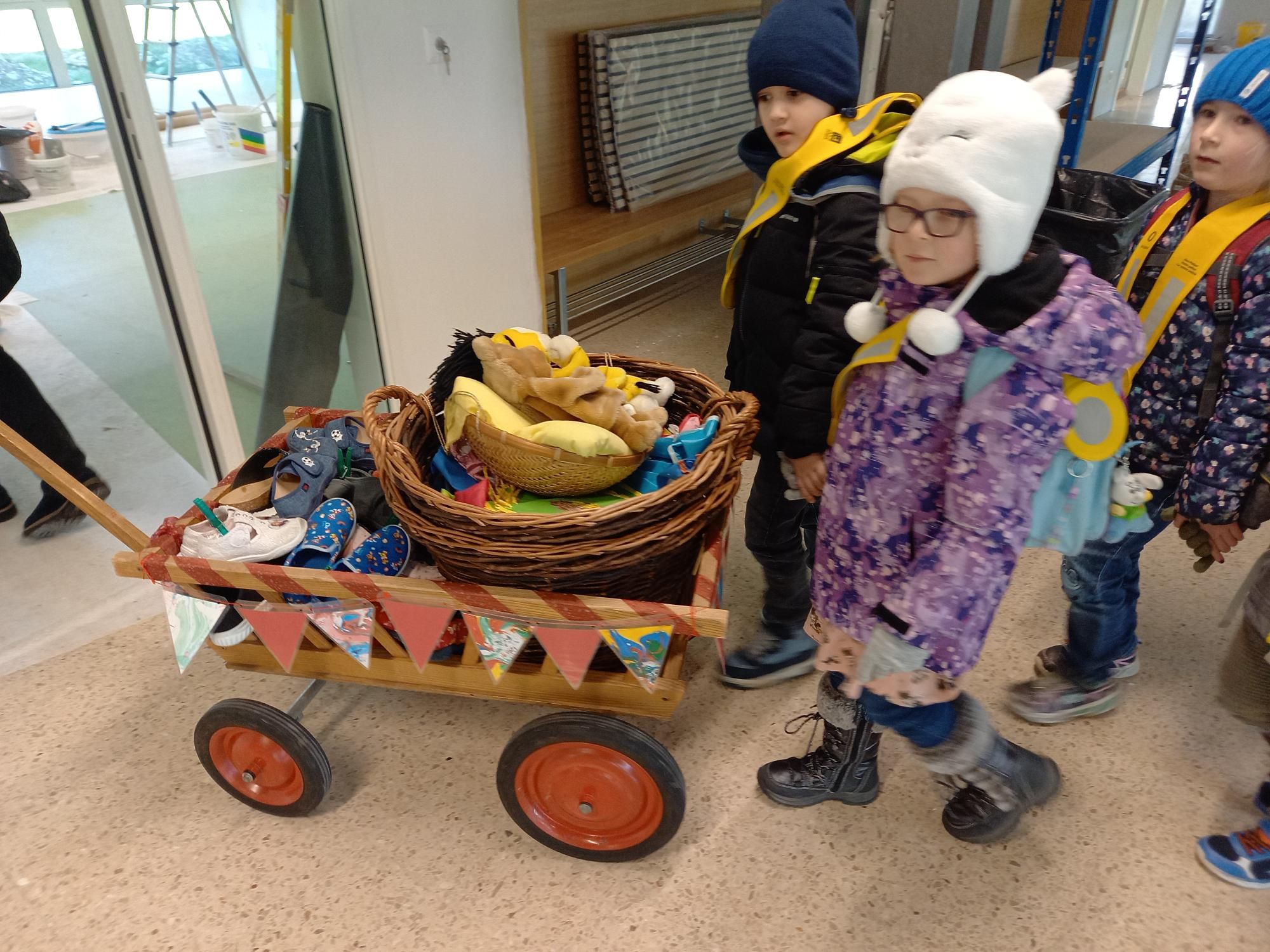 Gestern durften die Kindergartenkinder bereits in einer symbolischen Aktion ihre Finken ins Schulhaus transportieren. Ebenfalls der Tiger und der Bär sind mit dem Leiterwägeli mitgefahren. Bestimmt seid ihr Kinder schon gespannt wie der Kindergarten wohl nach den Ferien fertig eingerichtet aussehen wird.