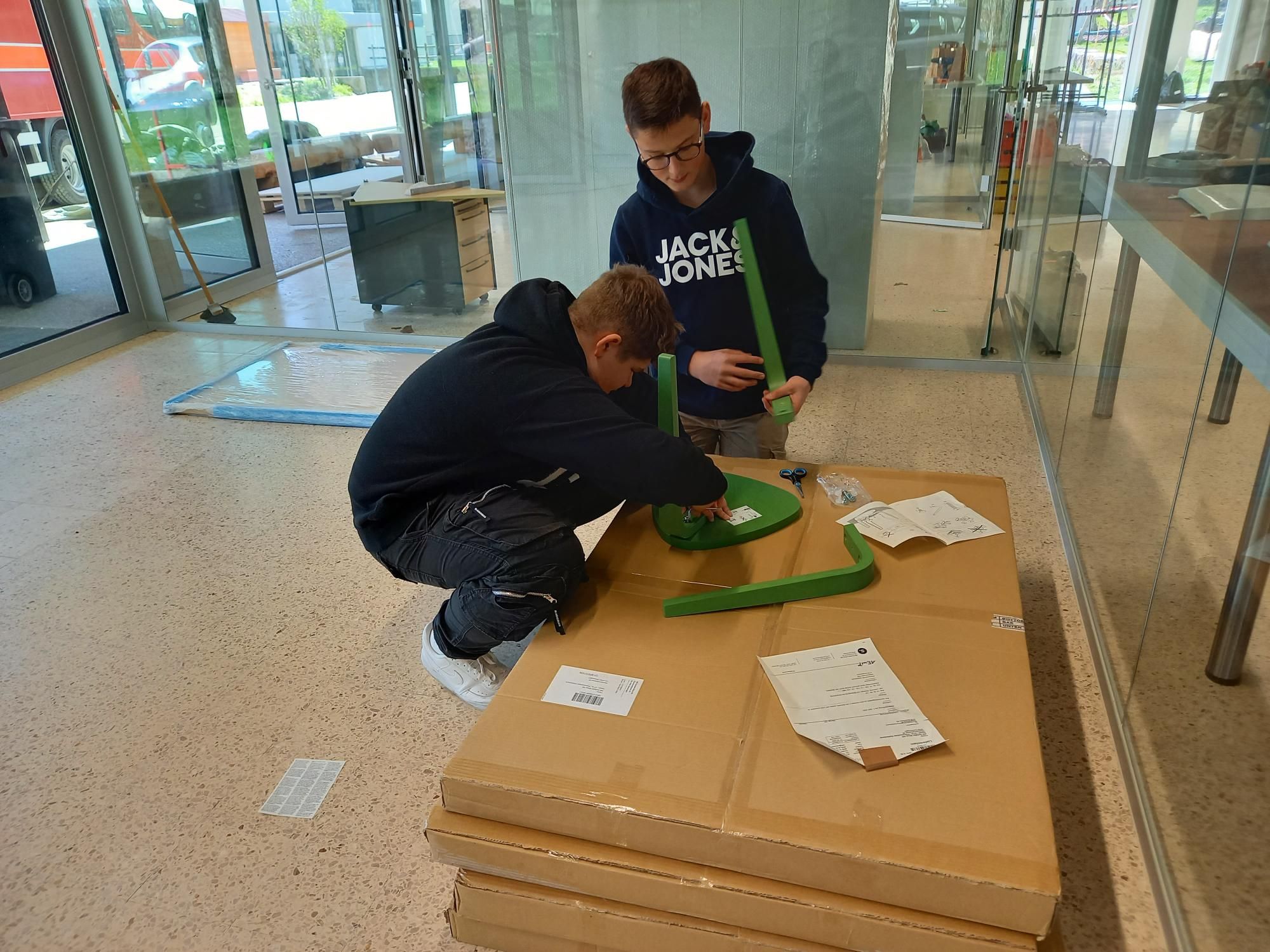 Mit fleissigen HelferInnen wurde das ganze Material des Kindergartens mithilfe des Feuerwehrautos in das Schulhaus transportiert. Frau Nussbaumer und Frau Haefeli hatte so einiges zu tun mit Anweisungen geben, wo das Material versorgt werden soll. Alles lief rund und die gute Planung zahlte sich aus. Gestärkt mit einer Pizza nahmen wir den Nachmittag in Angriff. Nun wurde geschraubt und gehämmert und die neuen Möbel geschickt zusammengebaut.