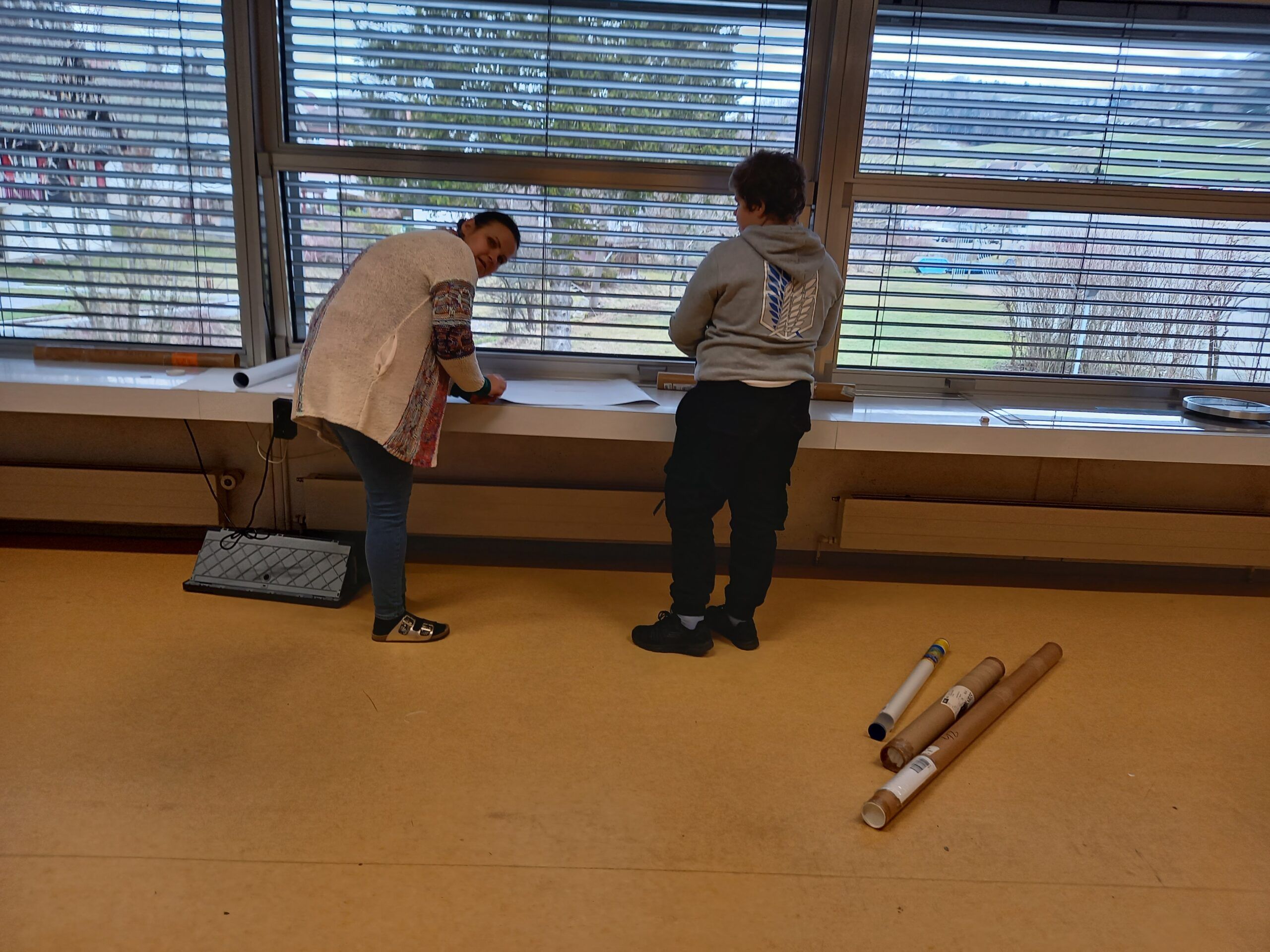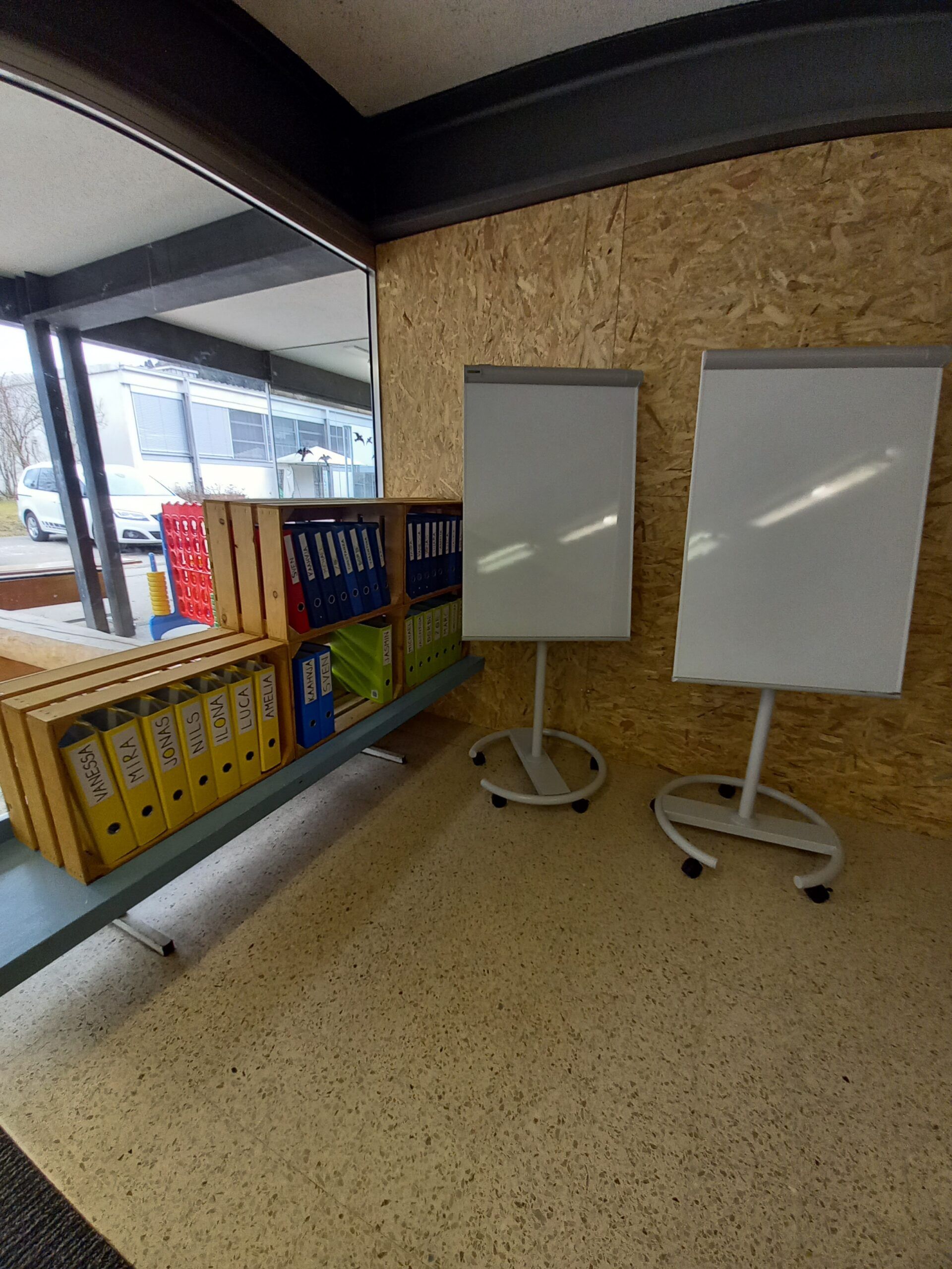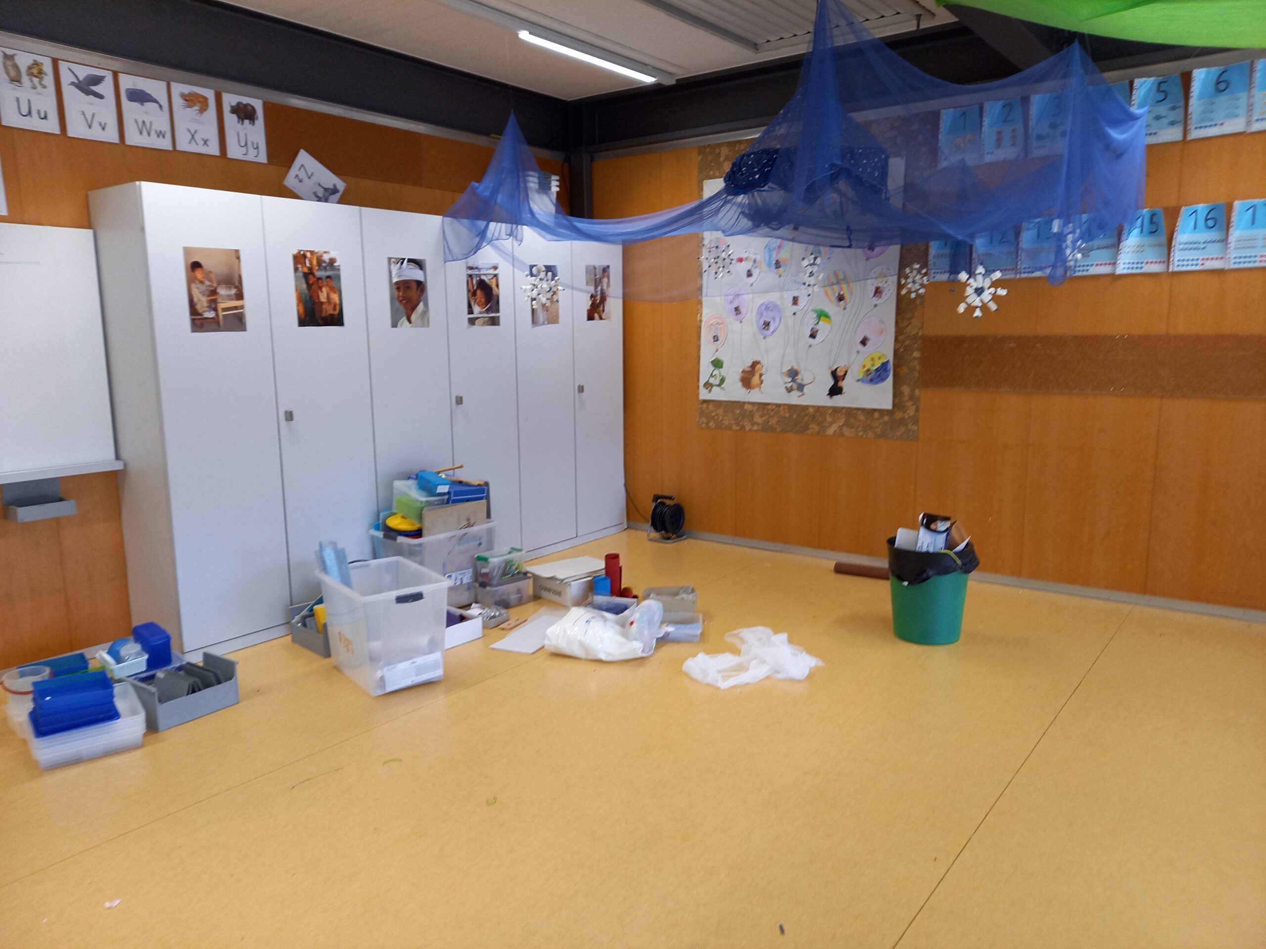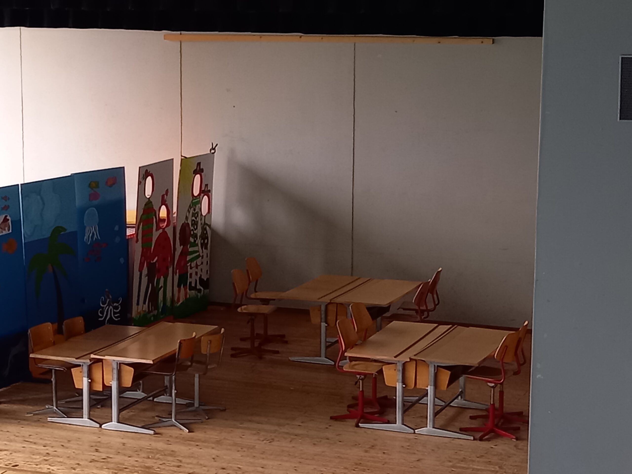 In der Mittagspause wird das 1.-3. Kl.-Zimmer bereits eingeweiht. Alle Plätze sind besetzt. Es wird nicht gerechnet und gelesen, sondern alle geniesse eine feine Pizza. Frisch gestärkt erfolgt am Nachmittag noch der Feinschliff. Übrige Möbelstücke werden mit einer letzten Fahrt weggebracht. Der Kontrollgang zeigt, wie fleissig gearbeitet wurde und dass bereits um 15.00 Uhr die Hauptarbeit erledigt ist. Die Helfer werden mit einem grossen Dankeschön verabschiedet. Nun geben die Lehrpersonen nochmals Vollgas. Das Unterrichtsmaterial wird eingeräumt und die Zimmer bekommen mit dem Aufhängen von Zeichnungen bereits Farbe.